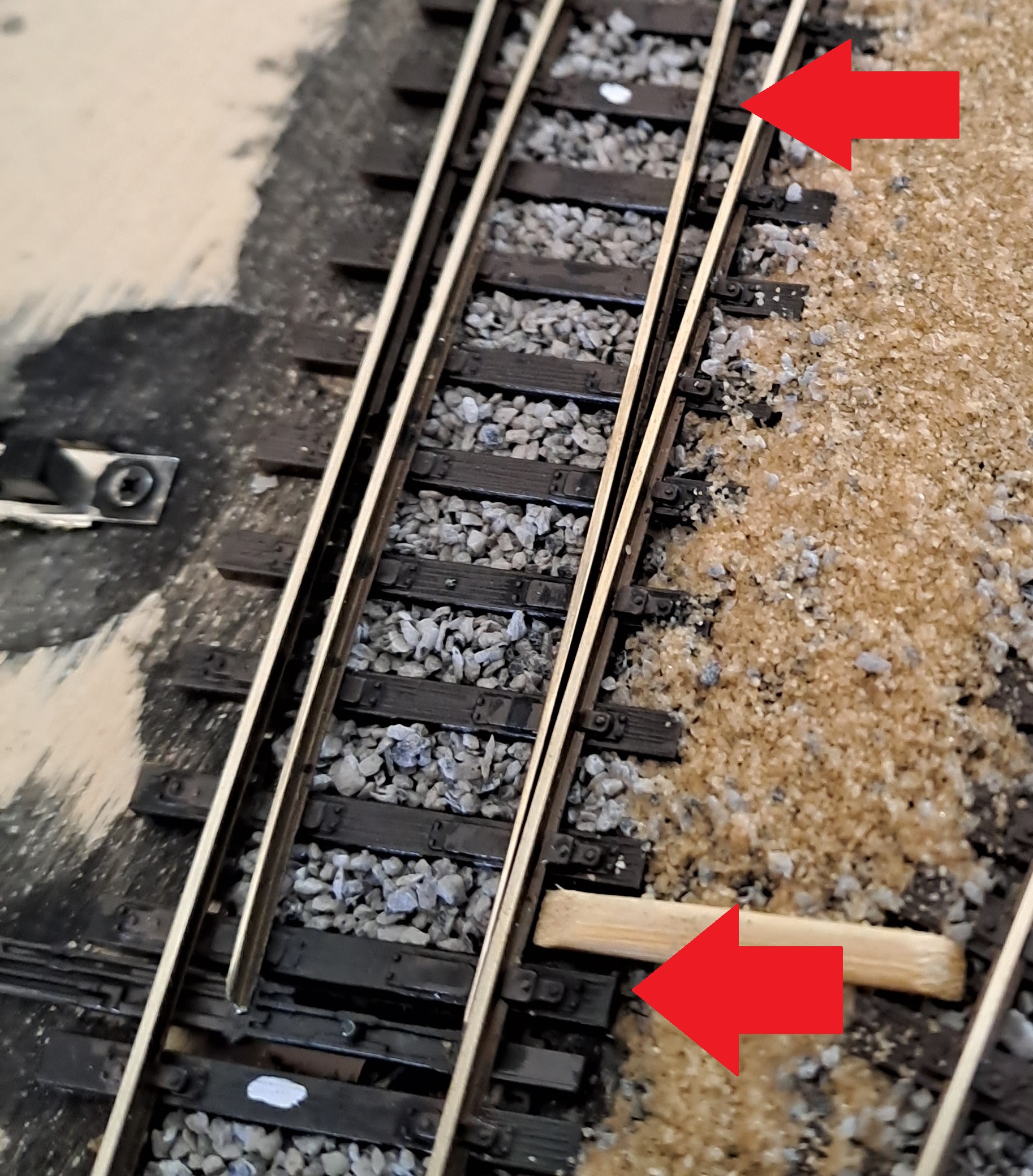 Determinata la zona di movimento degli aghi (vedi segni bianci sulle traversine evidenziati dalle frecce rosse) lentamente ho lasciato cadere la graniglia (Tillig art. 86607) e con l'ausilio di un pennellino piccolo l'ho distribuita tra le traversine cercando di restare al di sotto della parte superiore delle traversine.