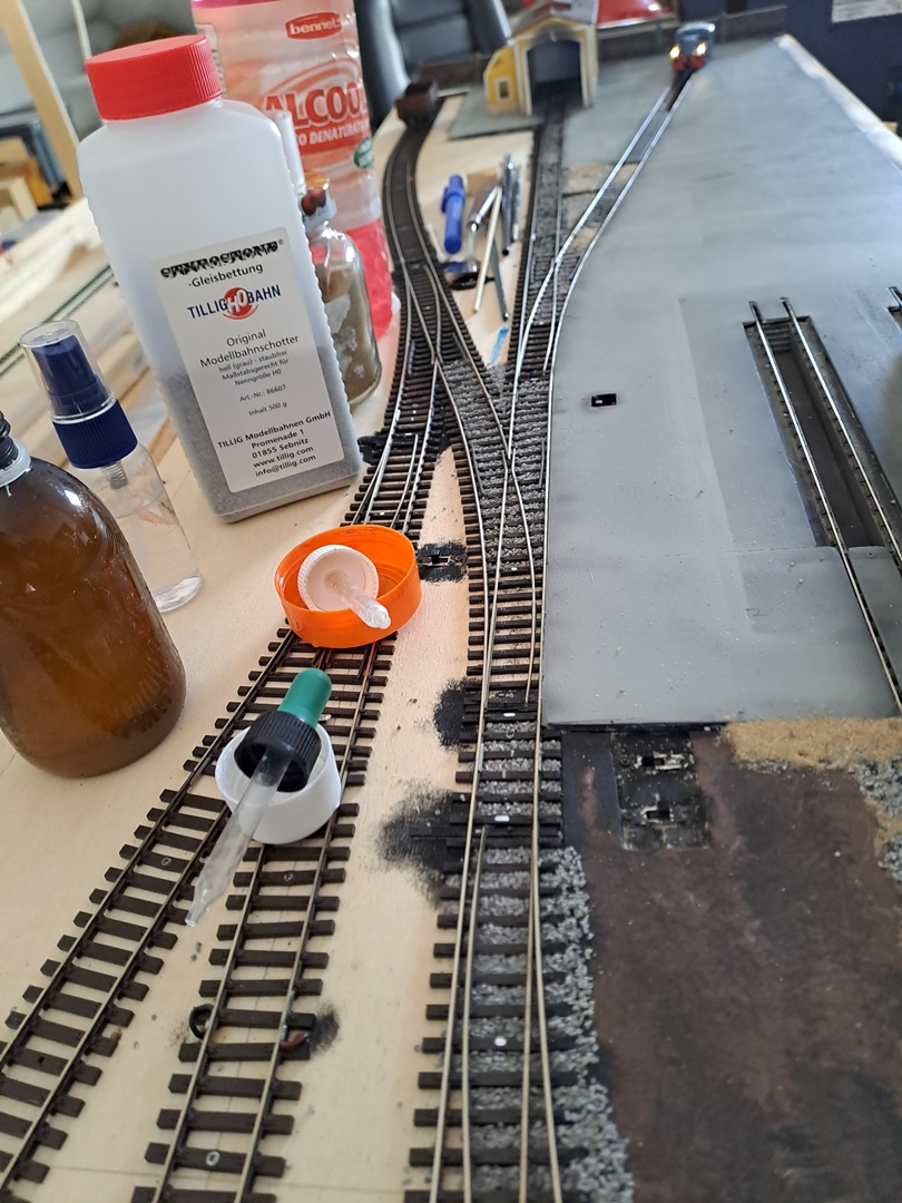 Dopo aver posato lungo tutti i binari la massicciata sono passato alla posa della graniglia sotto i deviatoi Tillig Elite Cod. 83.