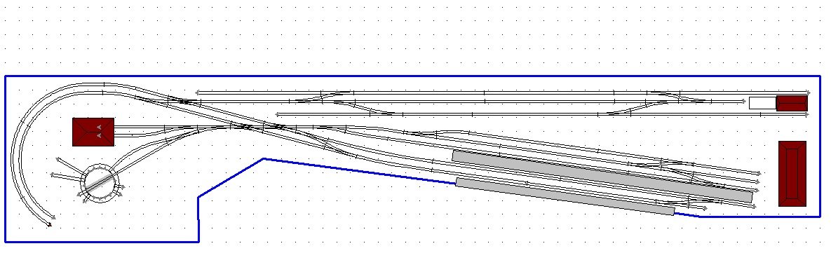 B) trattandosi di una stazione terminale di (suppongo) media importanza ho ridimensionato la lunghezza dei binari aggiungendo un collegamento al terzo binario ed eliminato uno dei binari dello scalo merci