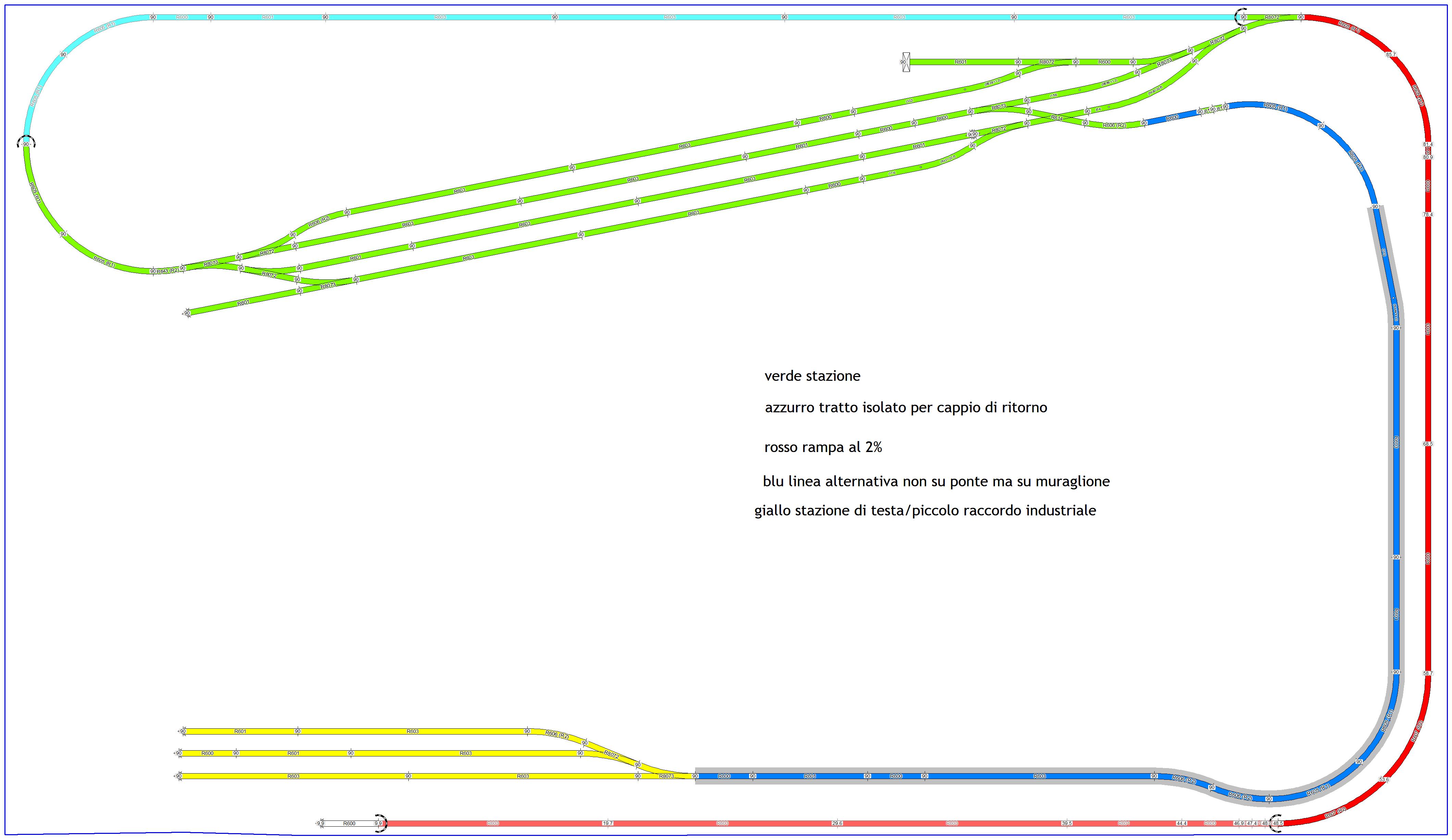 Ho provato a buttar giù il tracciato suggerito da Roberto con alcune mie integrazioni. Come dicevo prima, niente cappio inferiore ma deviatoi per un eventuale cambio di direzione in entrata/uscita dalla stazione principale. I due cappi che si formano si gestiranno elettricamente senza problemi, anche in zone nascoste con le barriere a raggi infrarossi.