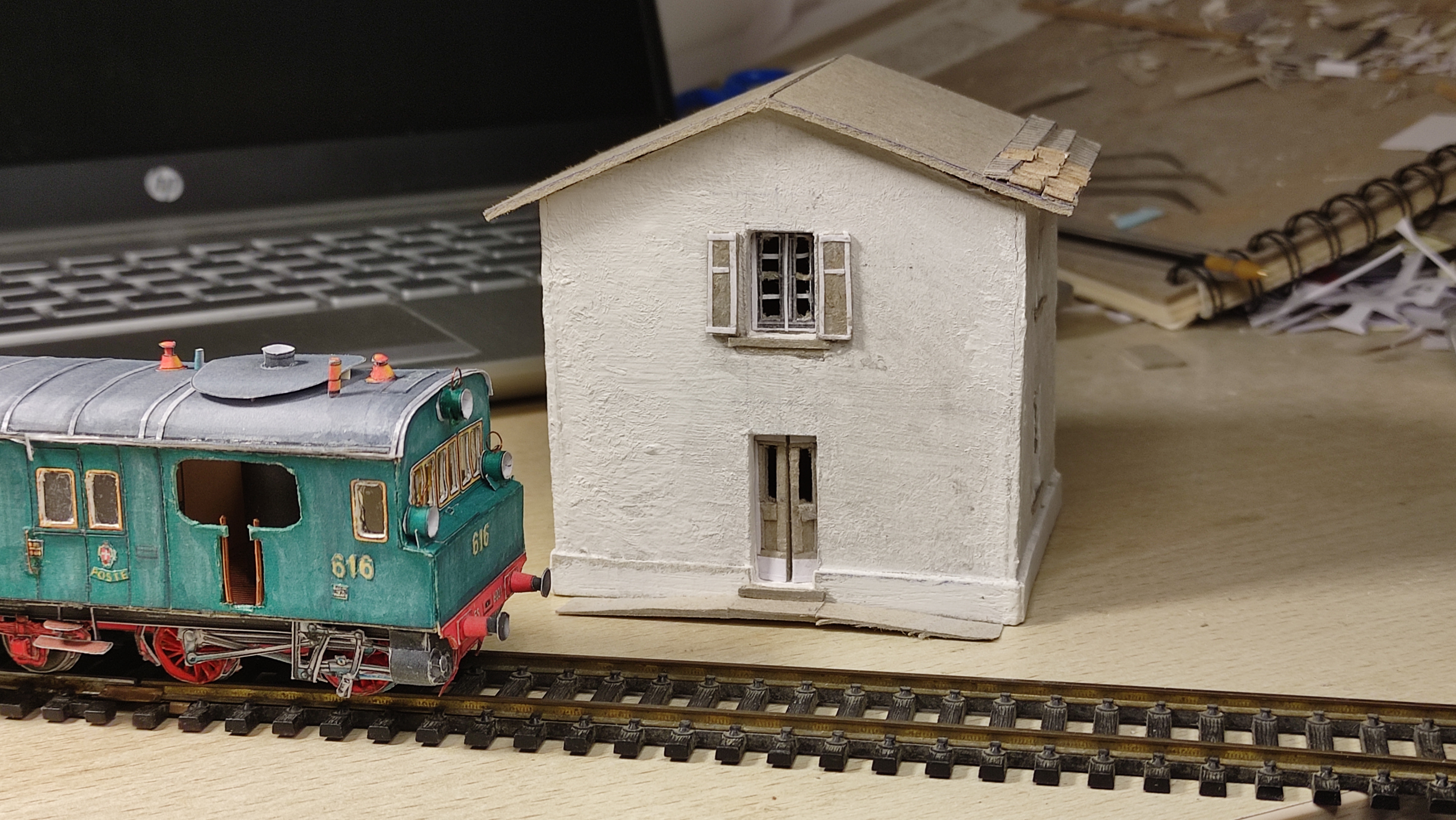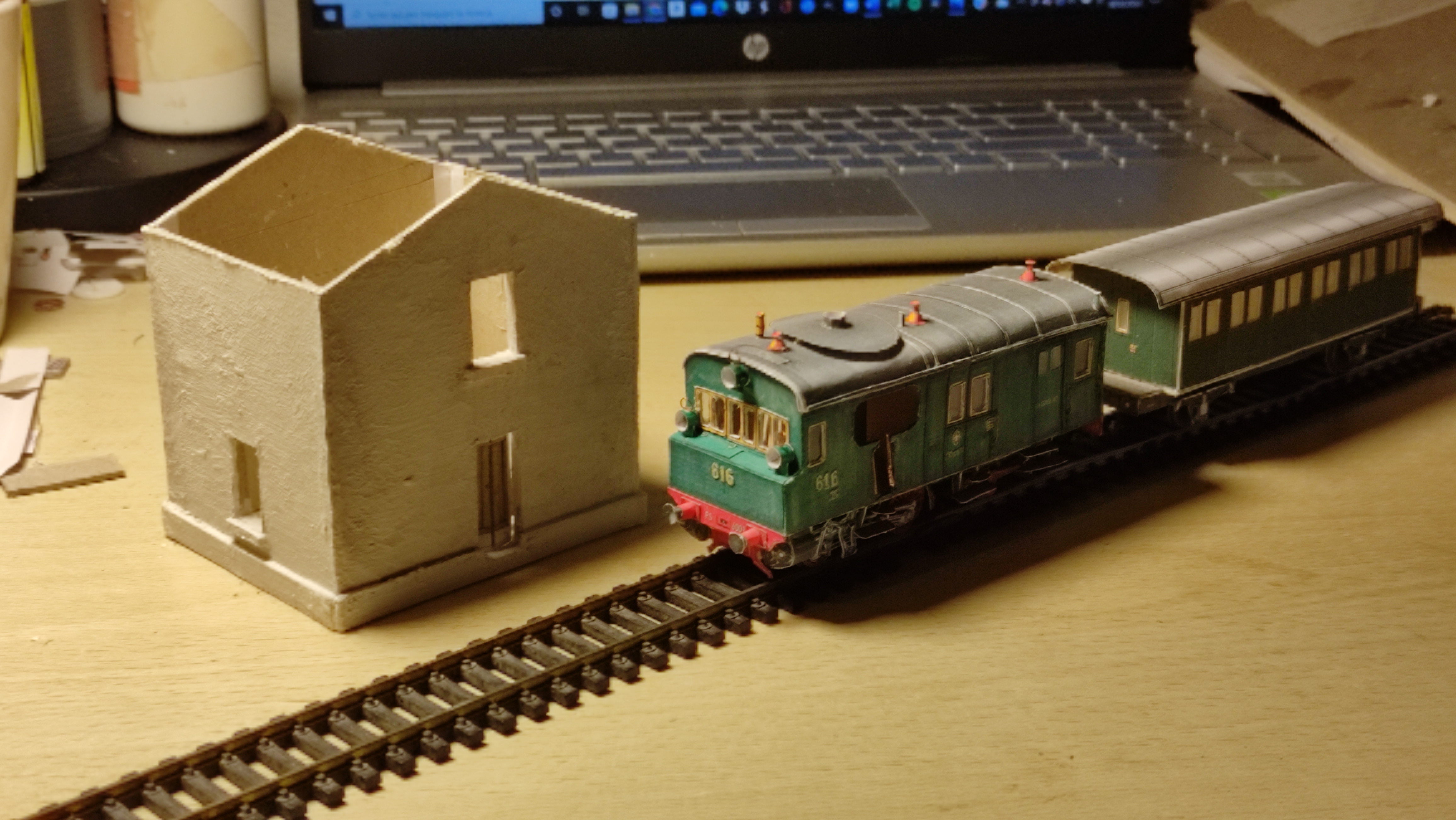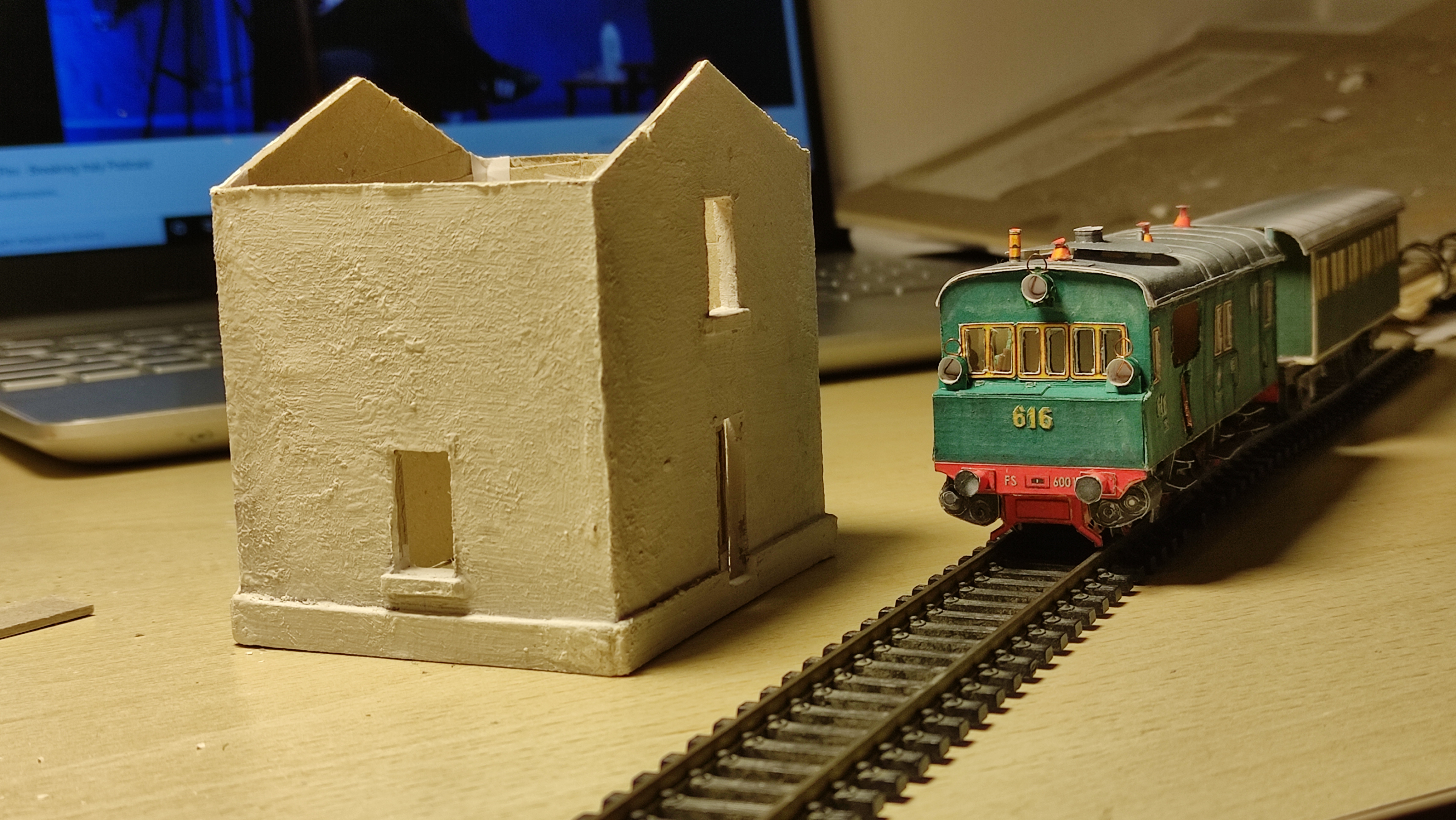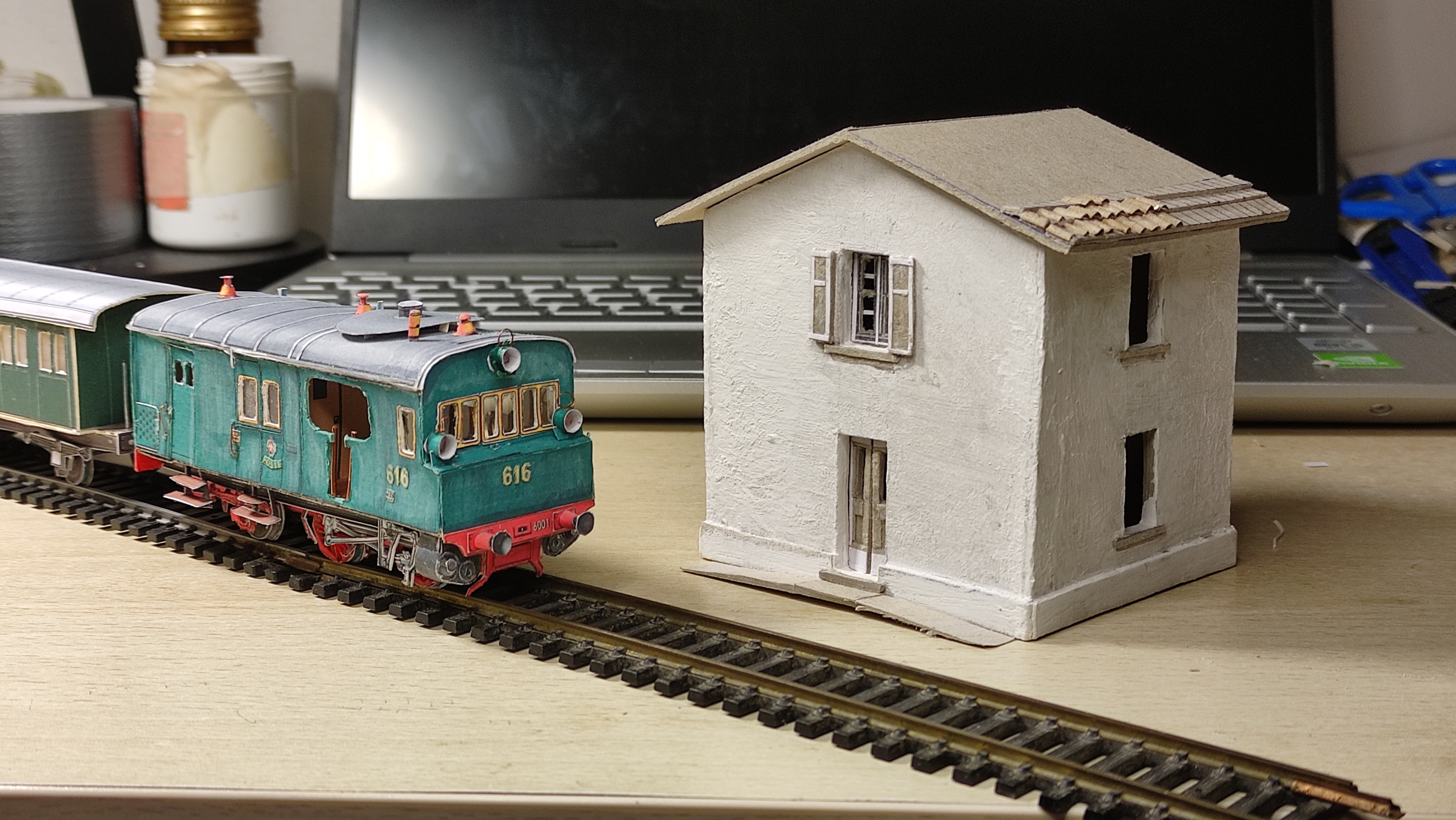 Ma soprattutto, habemus casellum! O meglio, un primo ritaglio delle pareti e un montaggio provvisorio, ma è già un inizio. Ho deciso infatti, per ora, di procedere con il diorama in contemporanea con il convoglio. Qualche foto giusto per provare l'insieme...