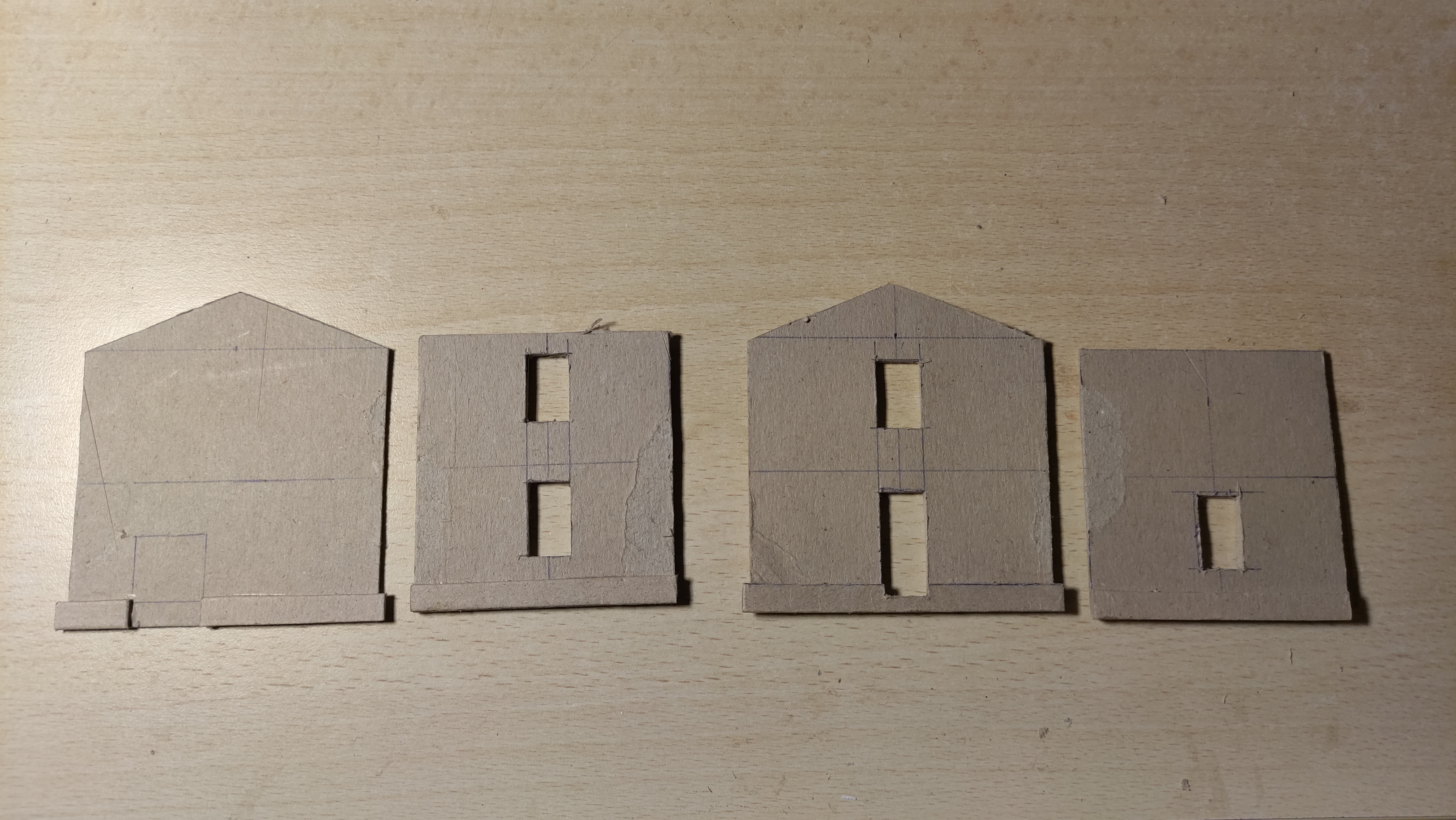 ...ennesimo aggiornamento notturno. Ho fatto un deciso passo in avanti con il casello. Innanzitutto ho ritagliato porta e finestre, poi ho incollato la striscia di basamento. Inoltre ho raddoppiato la profondità dei buchi degli infissi incollando dei pezzi di cartoncino. Qui vedete le quattro pareti smontate e poi incollate.