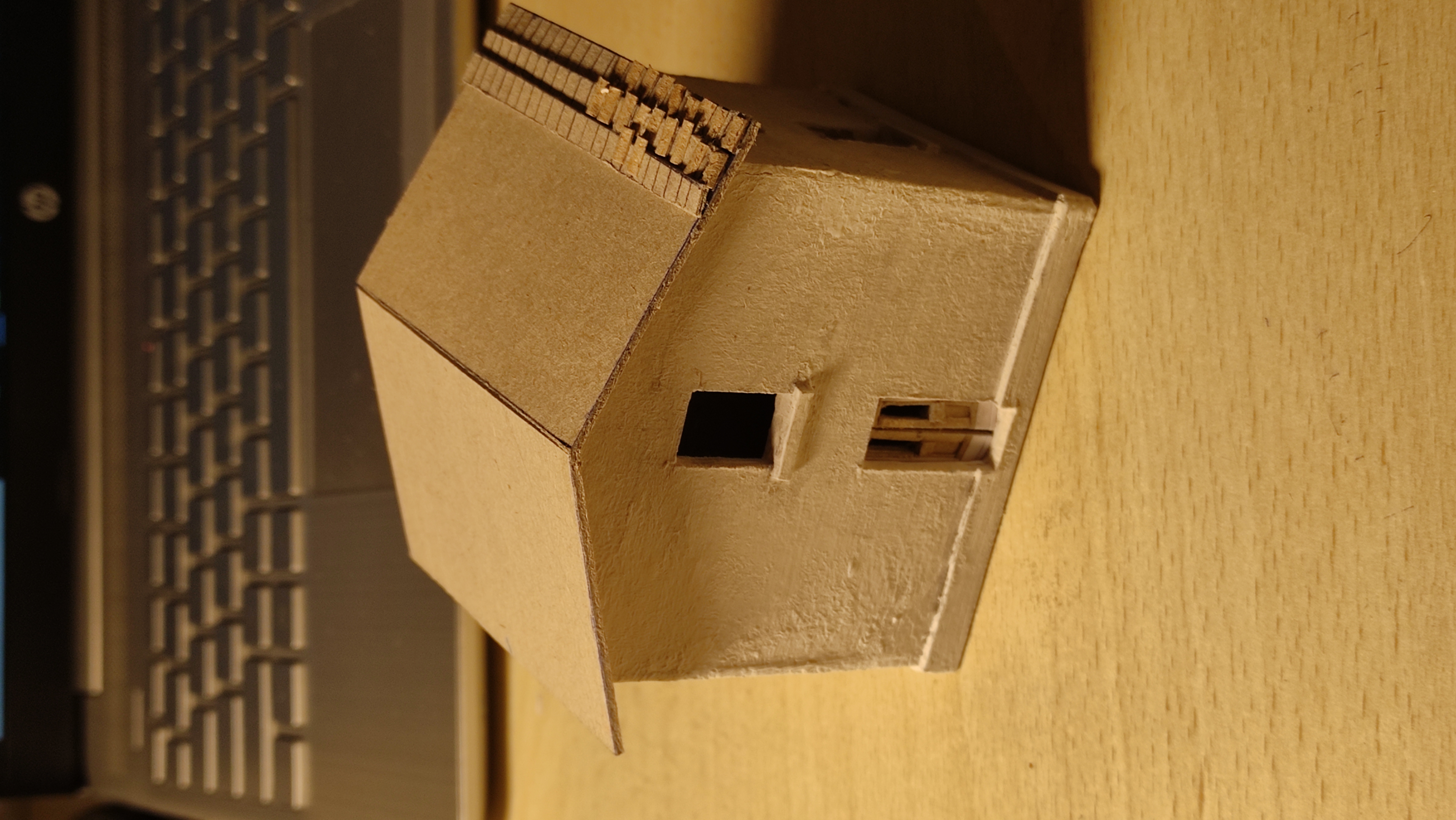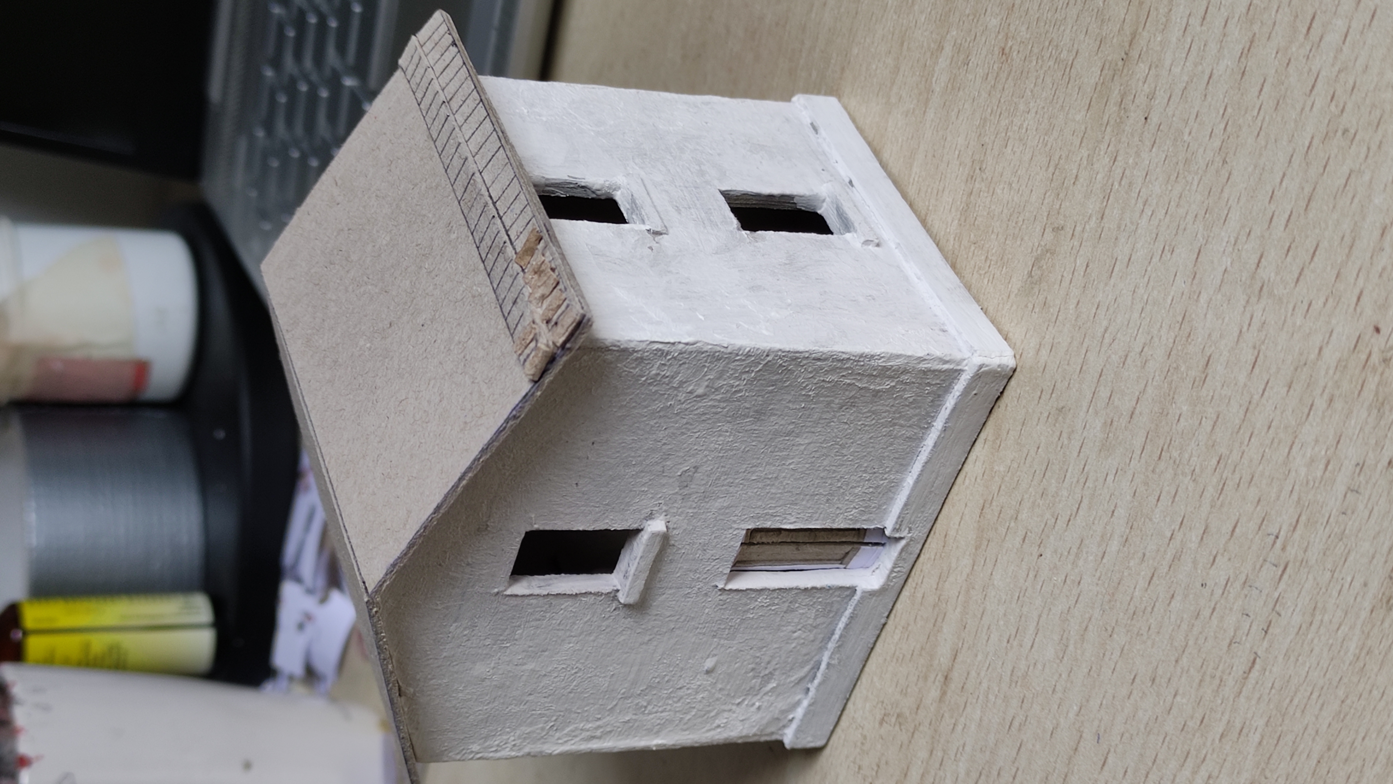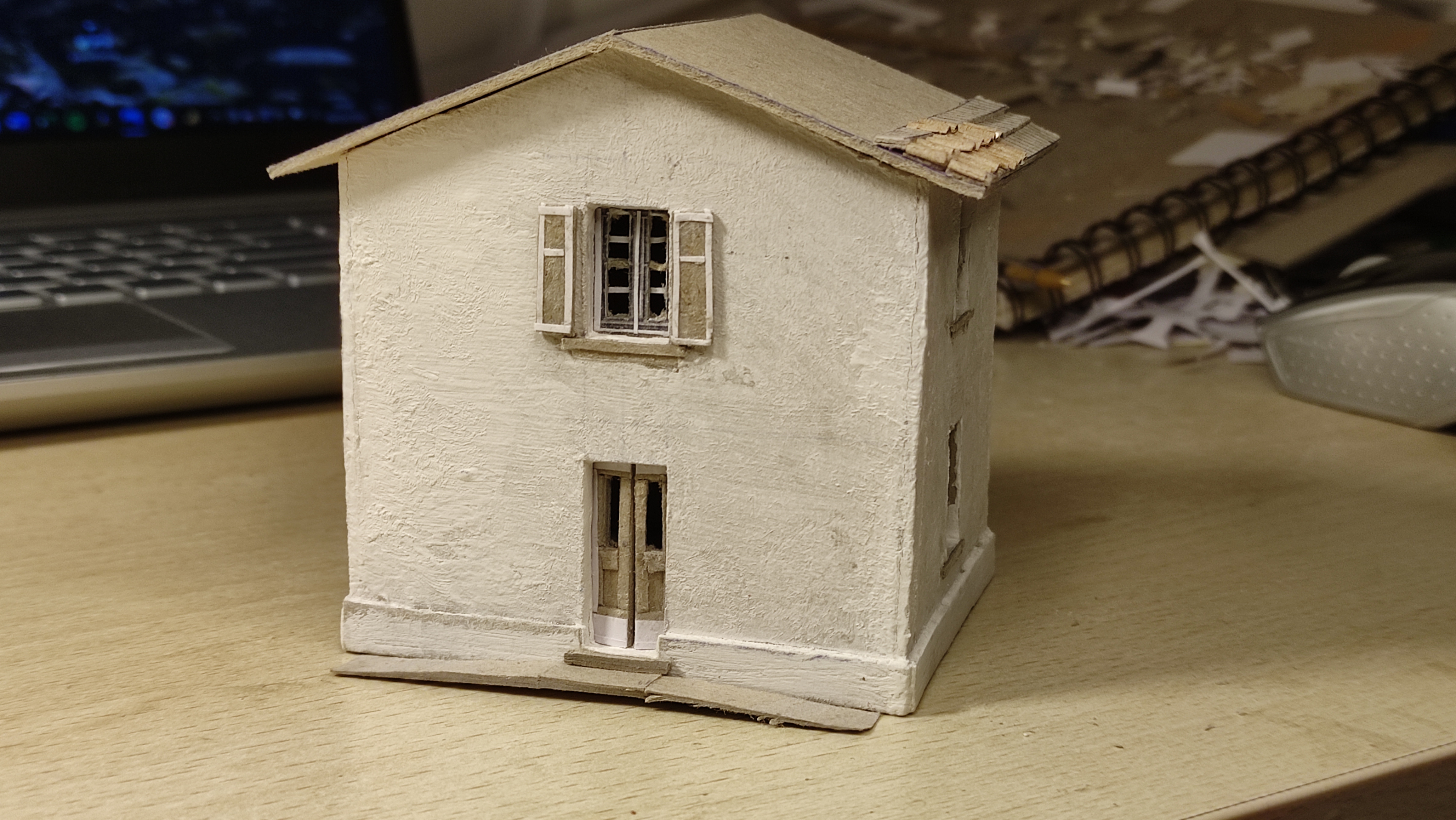 Nel frattempo, mente decido il da farsi, ho lasciato in sospeso la costruzione del tetto. Mi sono dedicato a provare a costruire un prototipo di finestra + scuri. Ho poi sostituito i davanzali con alcuni più sottili (considerate che andrà ancora tutto stuccato e andranno sistemate le fessure che si sono create con l'asciugatura dello stucco) e ho preparato la rampa davanti alla porta d'ingresso. Due foto: