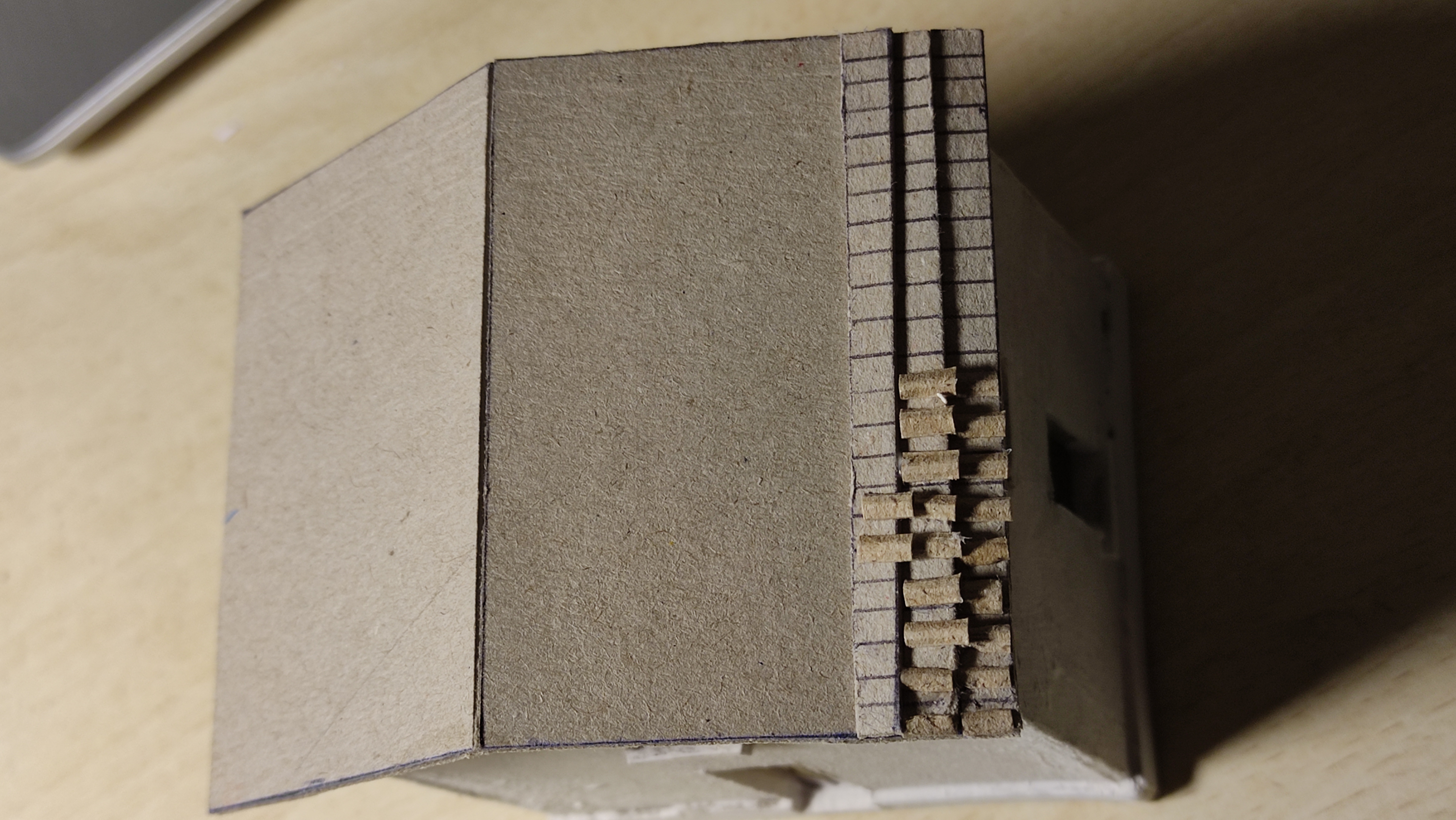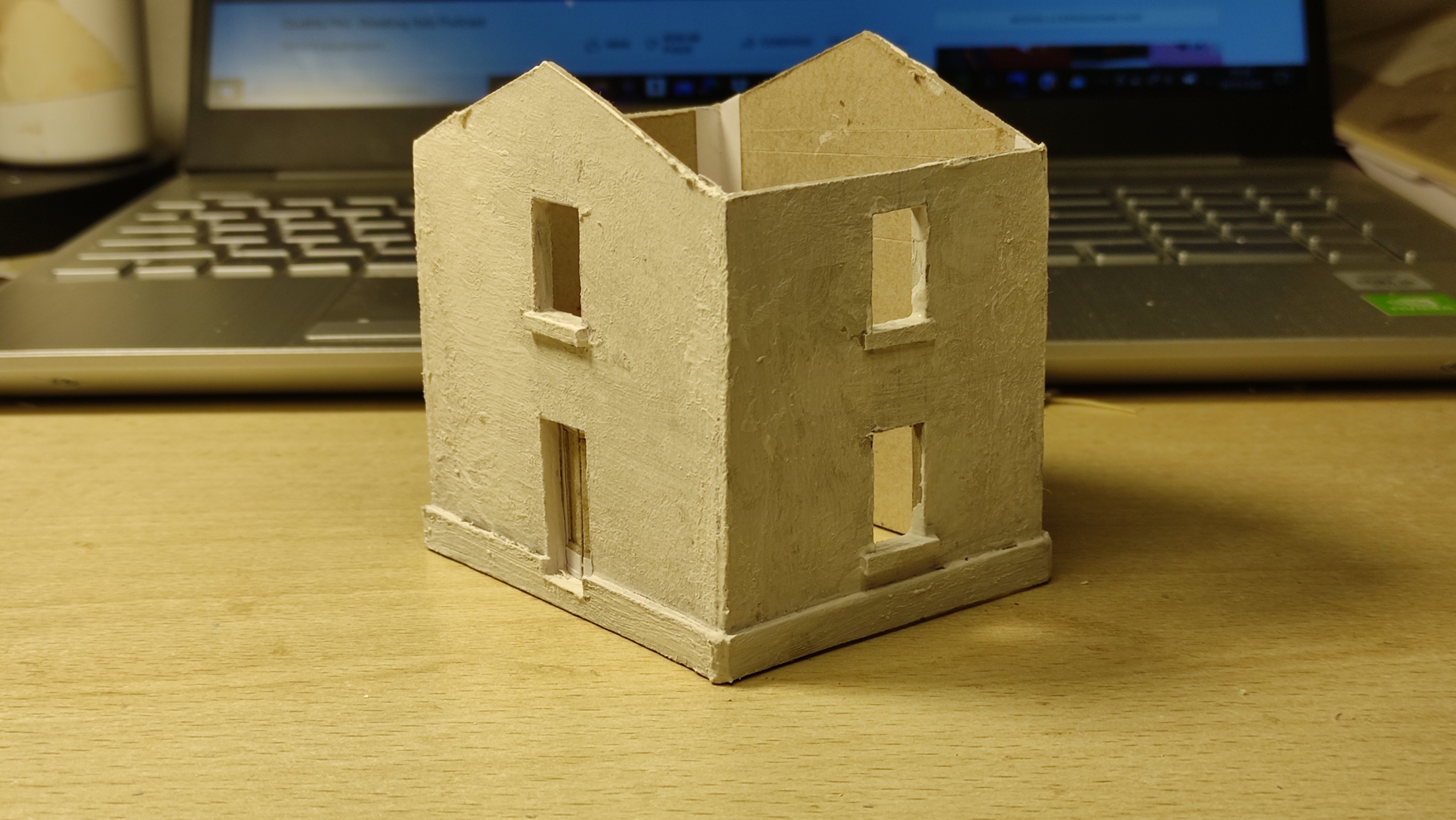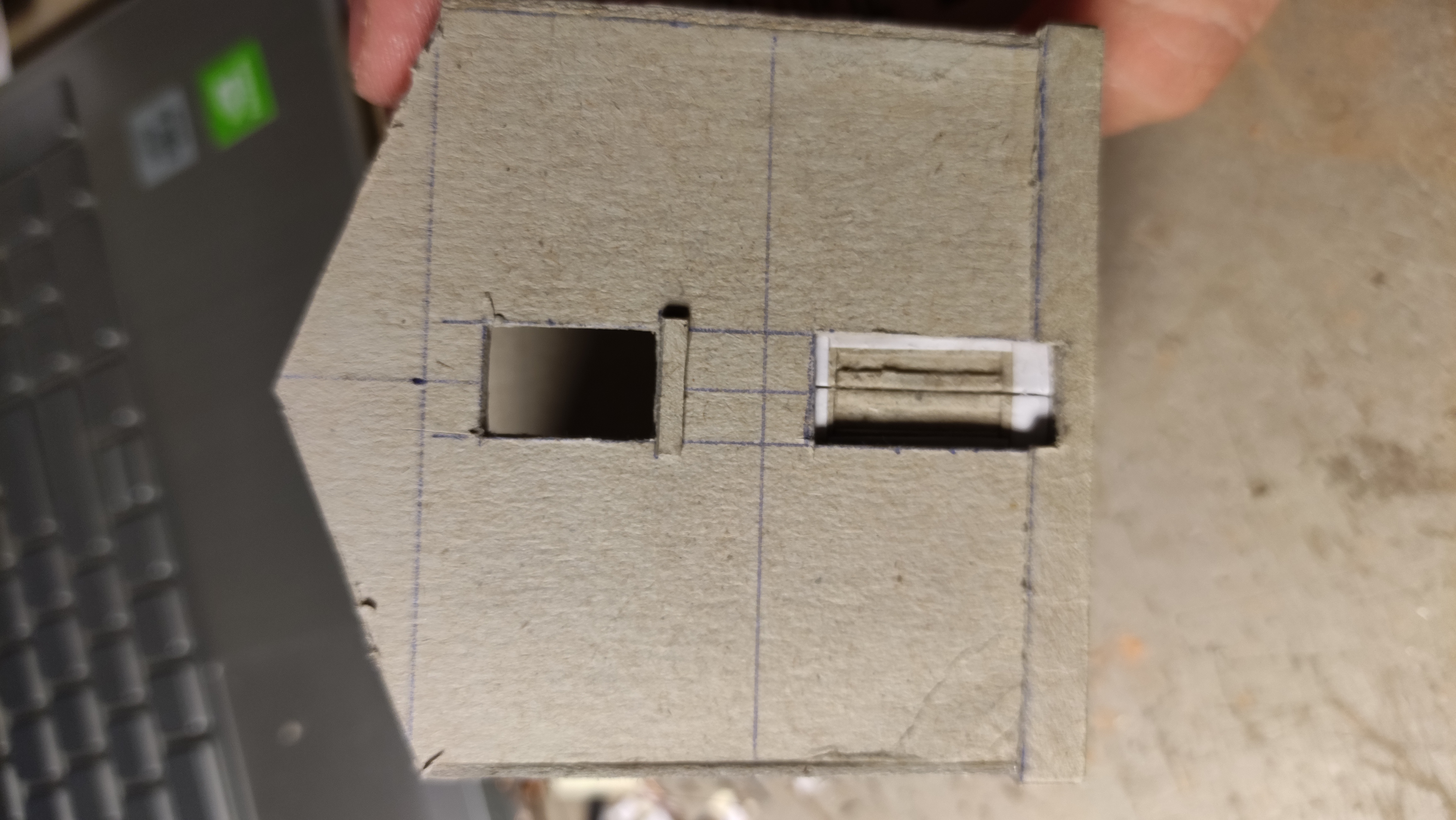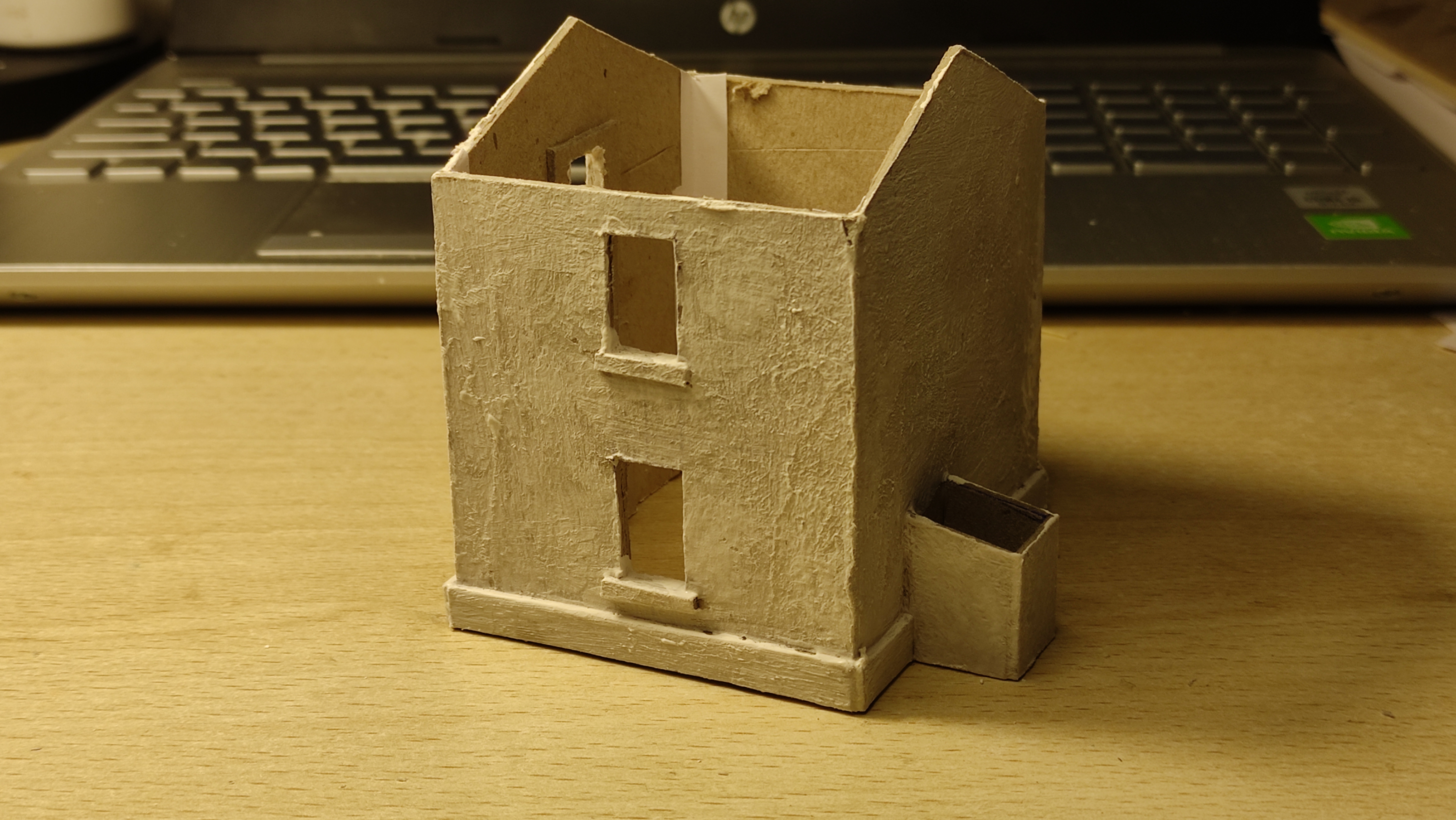 Nel frattempo, mente decido il da farsi, ho lasciato in sospeso la costruzione del tetto. Mi sono dedicato a provare a costruire un prototipo di finestra + scuri. Ho poi sostituito i davanzali con alcuni più sottili (considerate che andrà ancora tutto stuccato e andranno sistemate le fessure che si sono create con l'asciugatura dello stucco) e ho preparato la rampa davanti alla porta d'ingresso. Due foto: