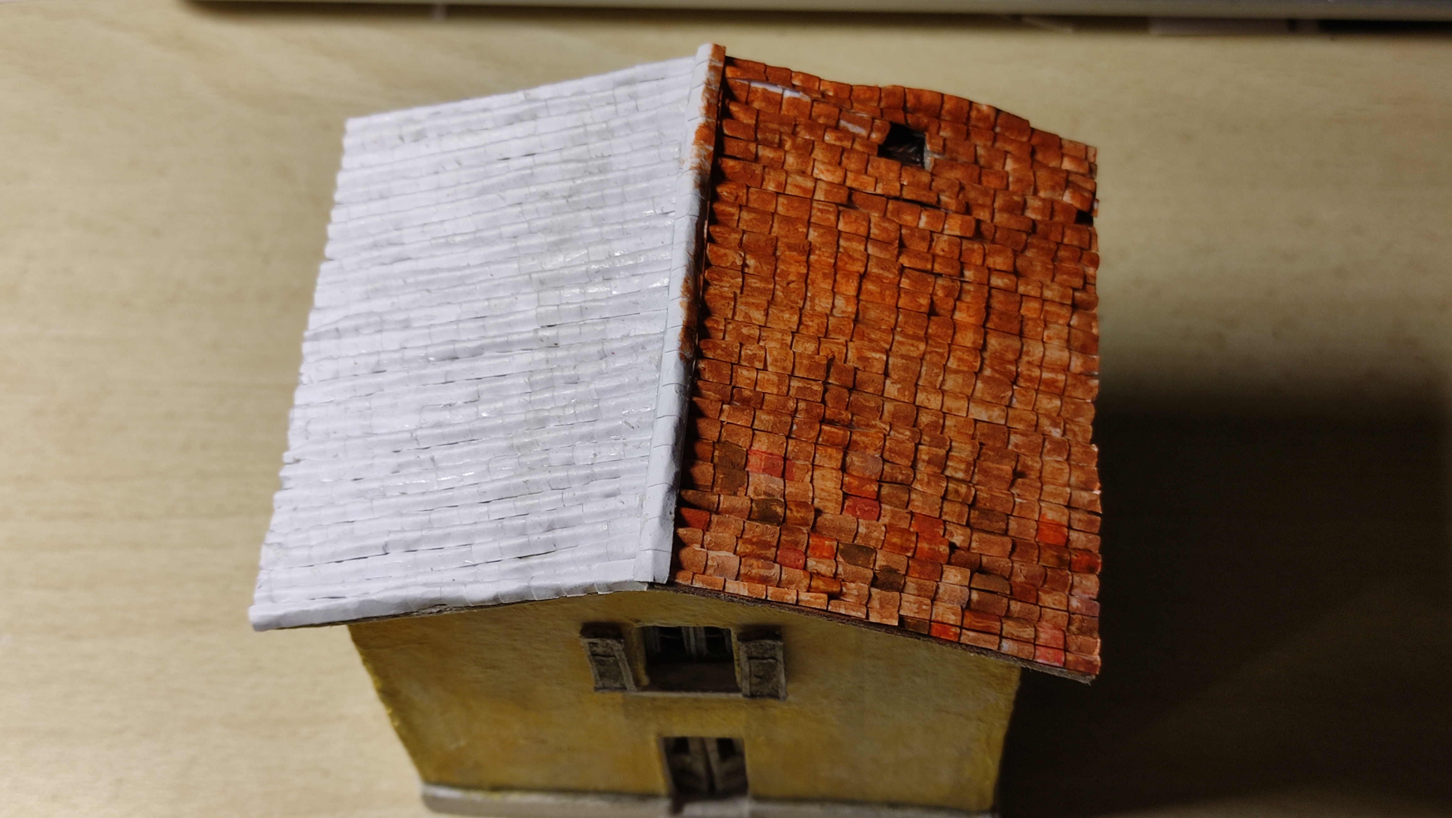 E dunque mini-aggiornamento: qualche ulteriore passaggio di colore sui muri e sul tetto (di cui ho diversificato un po' le tegole con qualche sfumatura); una grondaia montata (da colorare).