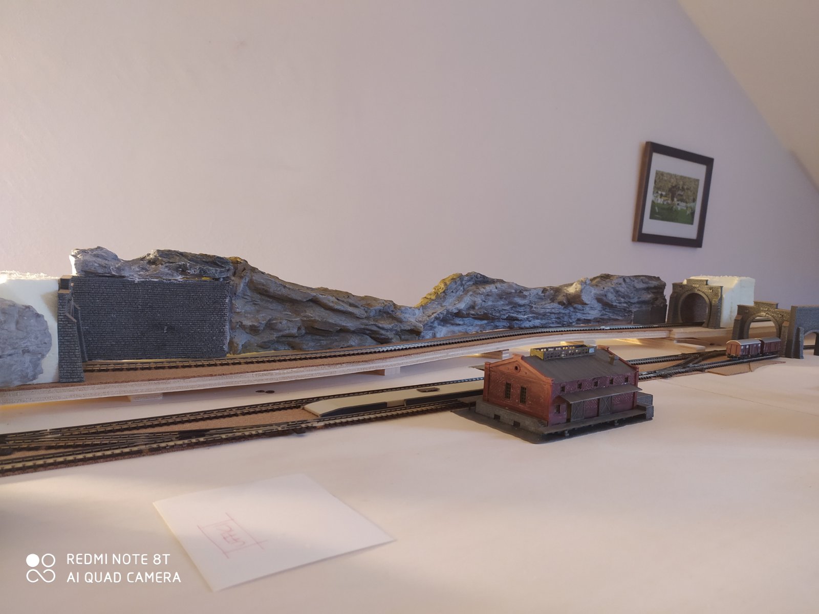 La prima foto la vista di insieme della zona industriale, nella seconda si vede la banchina realizzata da me ed ancora da verniciare, nella terza vista della parete rocciosa (ancora da finire) ed a seguire la stazione secondaria.