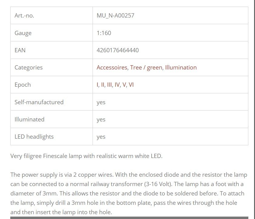 L'alimentatore avviene tramite 2 fili di rame. Con il diodo chiuso e il resistore la lampada può essere collegata a un normale trasformatore ferroviario (3-16 Volt).