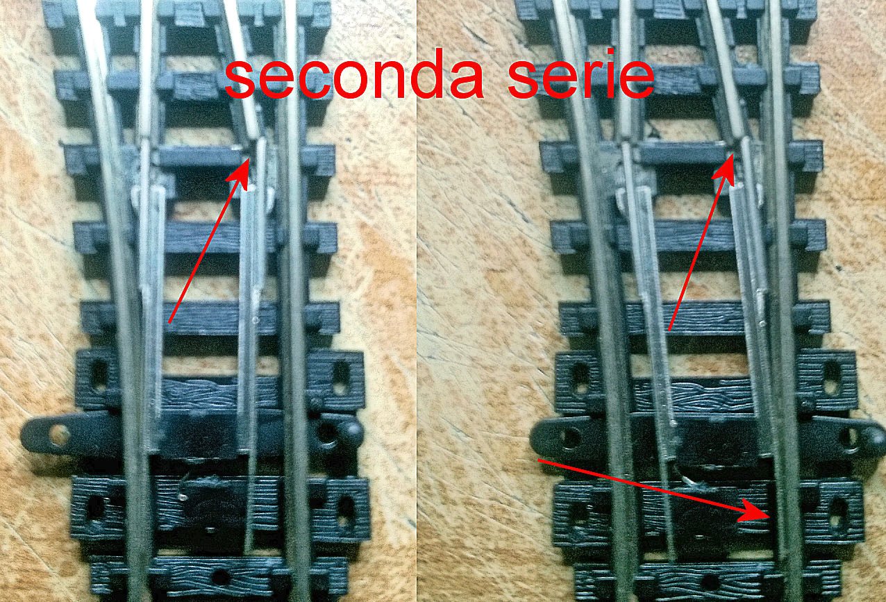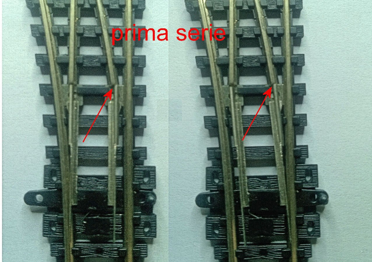 Ecco a me il gradino invece permane sia una direzione che nell altra e come a te l ago in questione non è fissato bene ma si muove facilmente.. Ma tu hai provato a motorizzarlo? Funziona? 3sal727 ha scritto: ↑mercoledì 5 giugno 2019, 21:48 Dei deviatoi sx nell'opera ne viene consegnato solamente uno, io ne ho preso un secondo, ed avendone due ho verificato il posizionamento dell'agoserie1.jpgquesto è il primo consegnato e come si può vedere la posizione dell'ago è distante dalla rotaia solamente nella direzione diritta, ininfluente al lavoro del deviatoio, spostandolo in deviata si nota un leggero gradino, che può non creare problemiserie 2.jpgquesto invece è il secondo consegnato e qui si nota la posizione dell'ago come nel precedente distante, spostandolo in deviata ha un distacco superiore alla prima immagine ed in più non combacia perfettamente con la rotaia, in tutti e due i deviatoi ho notato che non sono fissati bene si muovono, a parer mio col tempo possono anche creare problemi