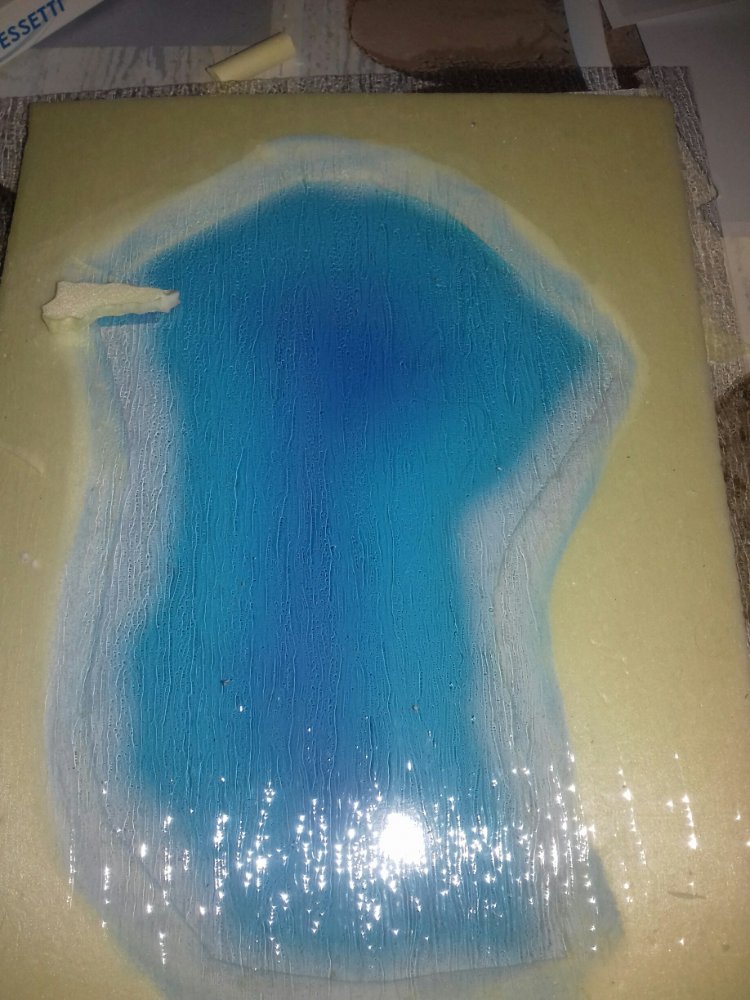 Ho iniziato a disegnare su un foglio di polistirolo di 1cm circa di spessore la sagoma del lago e intagliata poi ho carteggiato tutto il perimetro per arrivare a uno spessore di poco più di un mm Con un gessetto celeste e uno bianco ho colorato il bordo carteggiato poi ho messo la base del lago fornita da Francesco....sopra il foglio di polistirolo e infine il foglio sagomato fornito dalla DeA...questo è il risultato