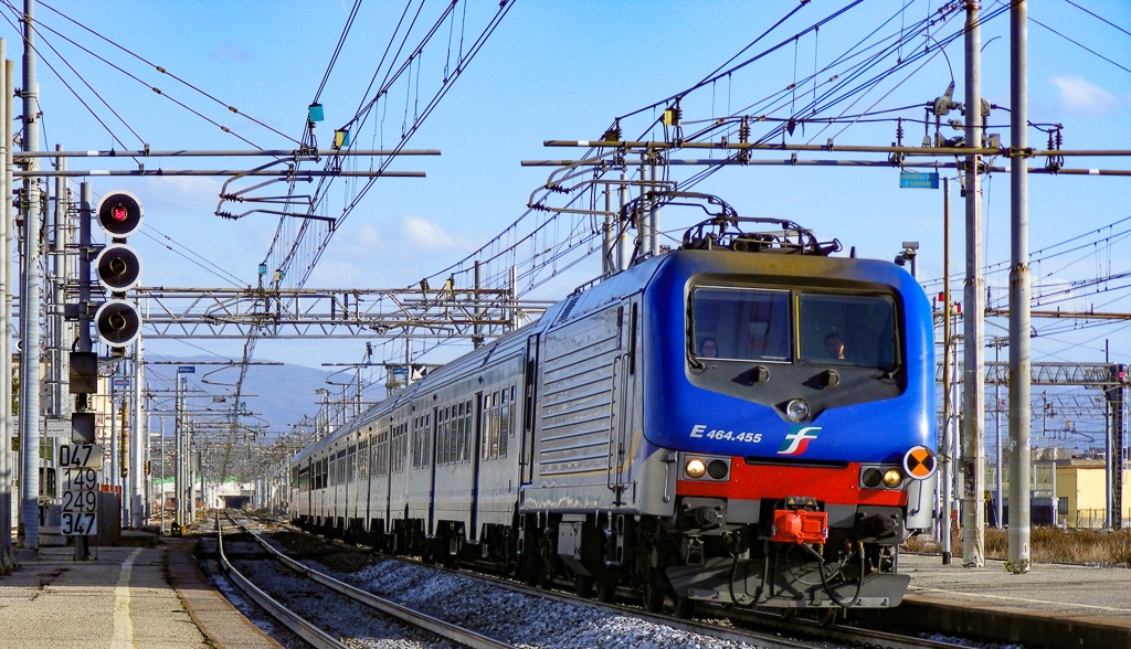Qualche secondo dopo che la 189 si è fermata scorgo un "coso rosso e blu" arrivare da nord, una rapida occhiata ai segnali e vedo che quello del binario 5 è disposto a via libera con indicatore di direzione 4 (quindi verso Empoli/Pisa), anche qui basta qualche secondo di attesa e...