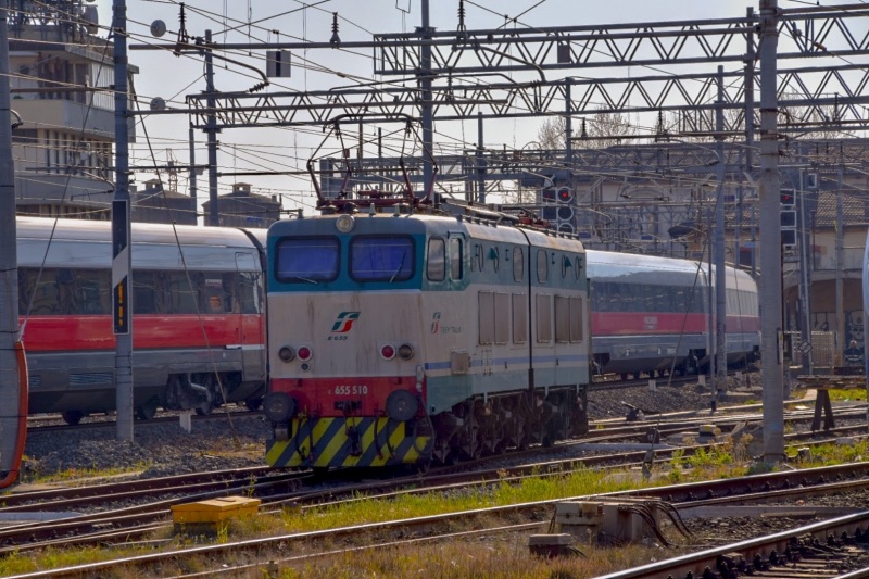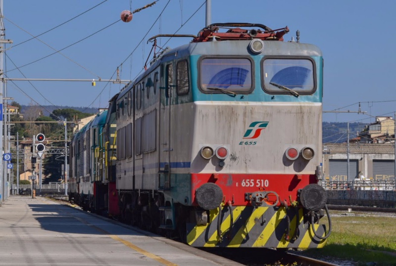 Arrivato in stazione (che tra l'altro è posta nelle immediate vicinanze del deposito di Firenze Romito), proprio all'interno del DL scorgo un bizzarro invio formato da: E655.510 + 245 + D445 + D445. Il caimano è abilitato, di conseguenza decido di fermarmi per aspettare le manovre. Dopo una decina di minuti si muovono i deviatoi e...eccolo che arriva!