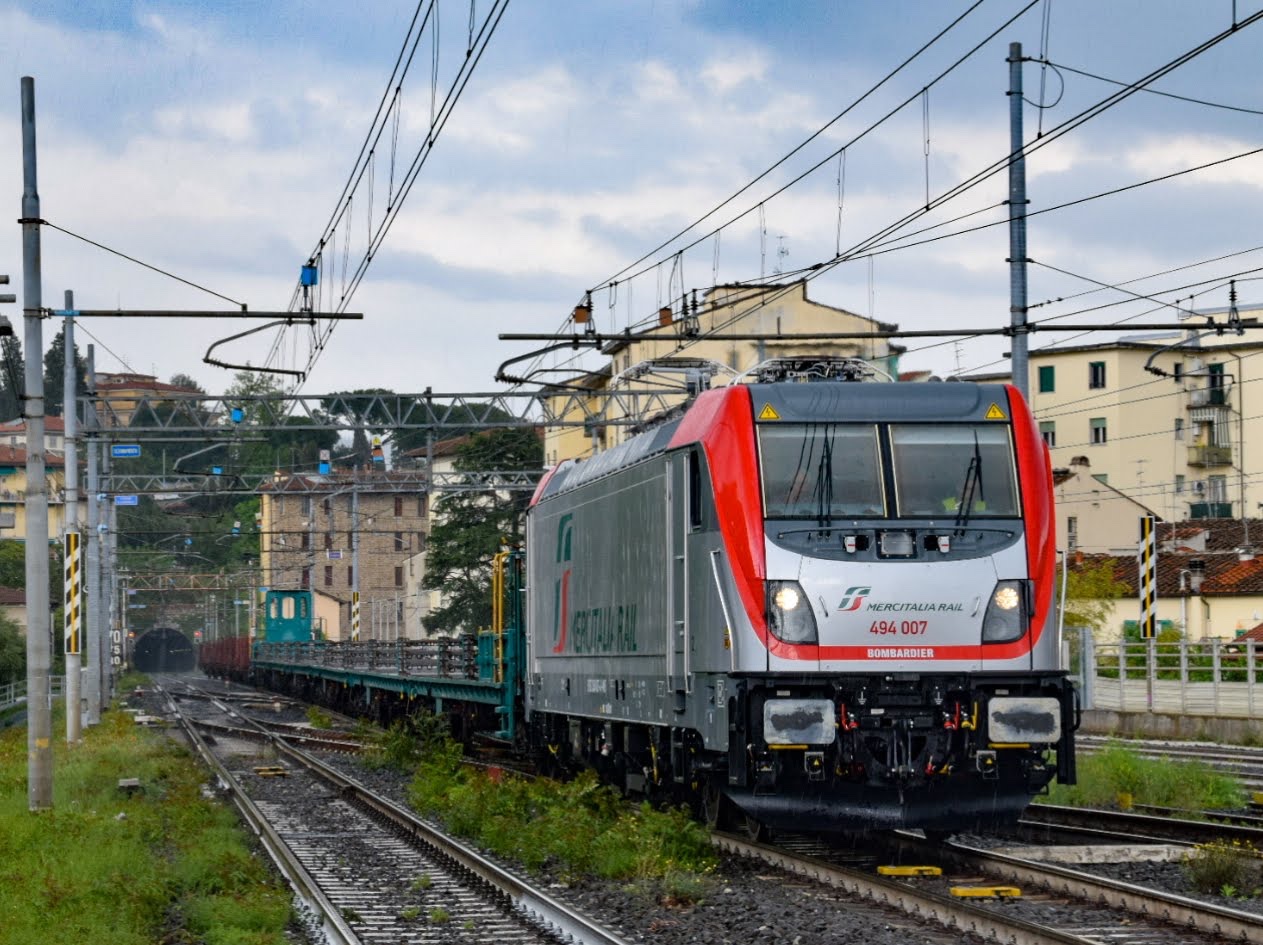 Prima apparizione toscana in testa ad un convoglio merci per il gruppo di locomotori E.494; questa unità era stata mandata il giorno precedente isolata a Chiusi per svolgere delle corse prova per l'abilitazione degli AdC toscani, e adesso se ne torna a Livorno con questa variegata composizione di carri pianali per il trasporto di rotaie.