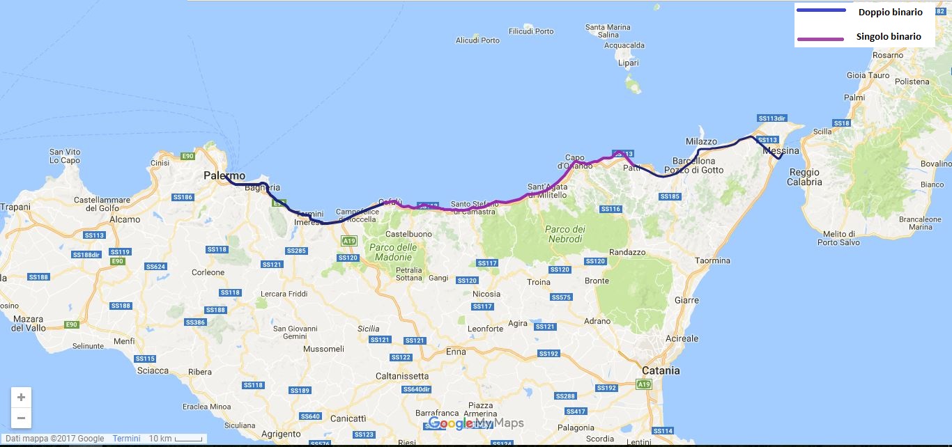 La ferrovia Palermo-Messina, lunga 224 km, è a doppio binario tra Palermo e Ogliastrillo e tra Patti e Messina, a singolo binario tra Ogliastrillo e Patti. In totale sono 122 i km di doppio binario su un totale di 224, pari a circa il 55%.