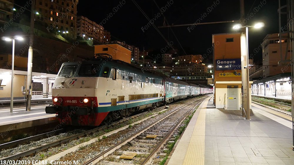 E 444.005 alla trazione del treno Eurocity 147 in partenza da Genova Piazza Principe
