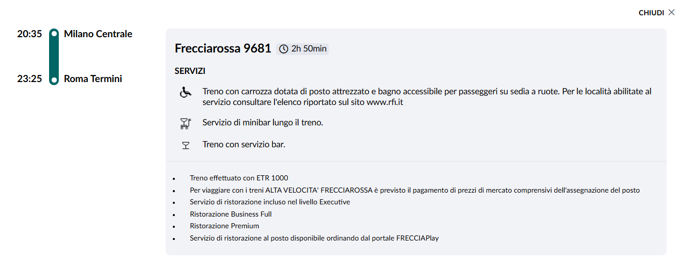 Il treno Udine-Malpensa parte da a Udine alle 06:15, arriva a Milano Centrale alle 10.15 e prosegue per Malpensa, con arrivo alle 11:16. Dall'Aeroporto di Malpensa il Frecciarossa parte 11.37 raggiunge Milano Centrale alle 12.46 e prosegue verso Venezia, con arrivo a Venezia Santa Lucia alle 15.12.