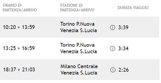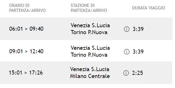 Saranno disponibili due collegamenti tra Torino Porta Nuova-Venezia Santa Lucia, cui si aggiunge un collegamento tra Milano Centrale e Venezia Santa Lucia. Tutti i treni saranno espletati con i nuovi ETR 675 "Pendolino Evo".