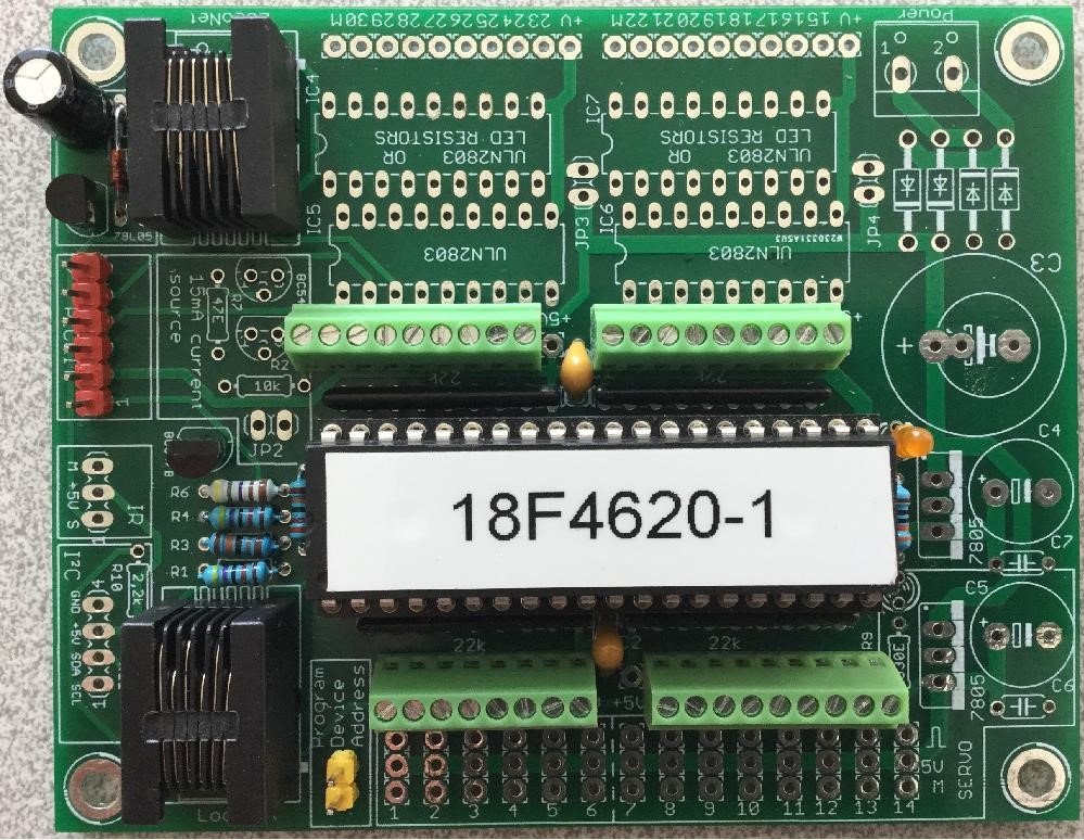 Sopra il PIC sempre i pin da 2 per collegare i Dupont, più sopra sempre i morsetti da PCB e la possibilità di inserire i c.i. ULN2803 per comandare gli scambi con bobine dal piedini 15 al 30, oppure inserire le resistenze per il led.