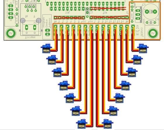 Dalla porta 1 alla 14 collegamento ai servo, con regolazione del range che vedremo nella programmazione.