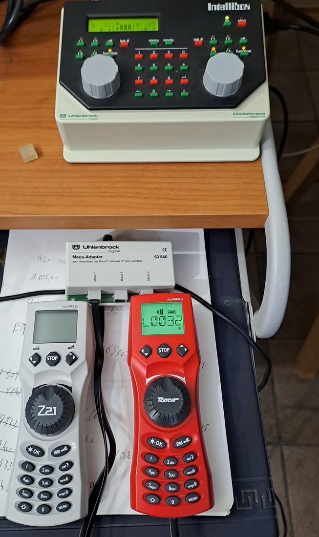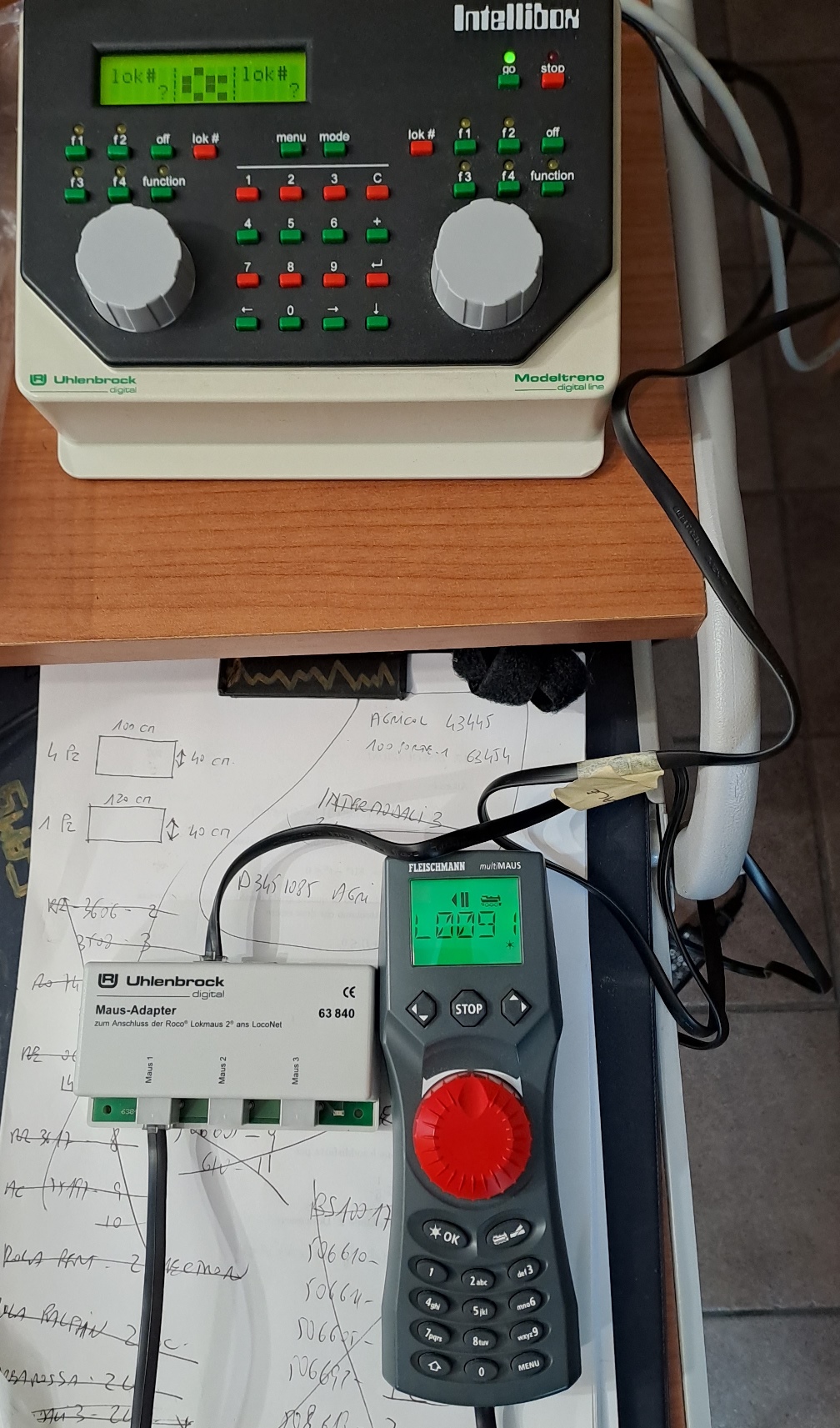 Temo che ci sia una incompatibilità di comunicazione, infatti quando si blocca il MultiMaus il led rosso del Uhlenbrock Maus Adapter smette di lampeggiare, come se MultiMaus Z21 grigio e centrale Intellibox smettessero di "parlarsi".