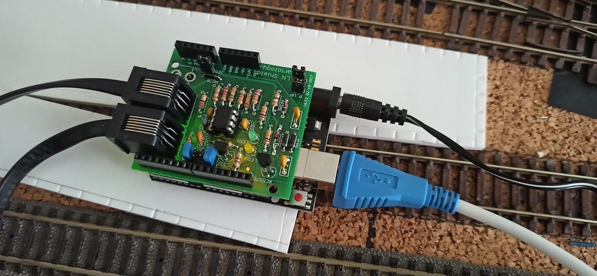 una interfaccia loconet, montata come shield per Arduino Uno (http://nh-finescale.nl/fremo/dcc/fremo- ... hield.html) che si interfaccia, via pc, con Rocrail tramite il software LocoLinx (http://loconetovertcp.sourceforge.net/I ... oLNShield/). Possiamo considerlo il cuore del sistema;