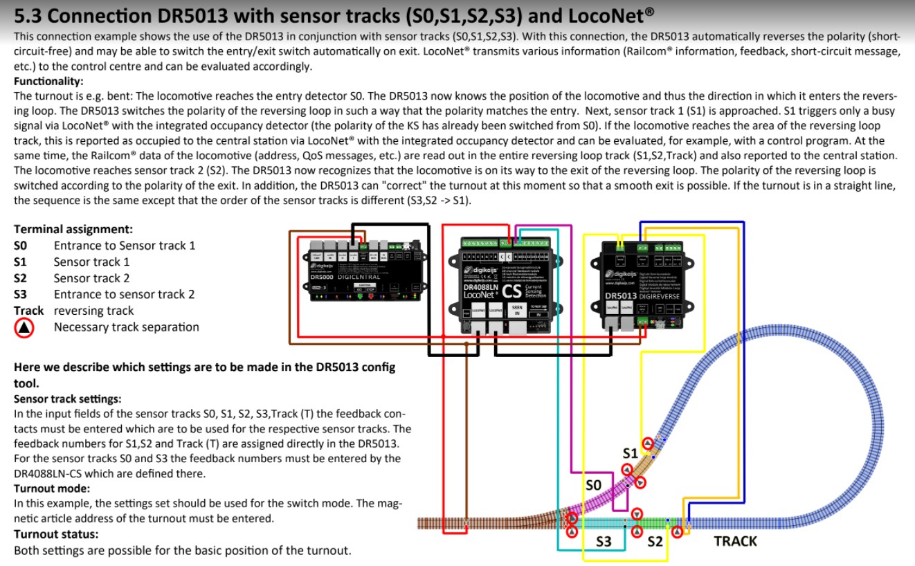 Non ho studiato come funziona la DR5013 ma credo che inverta la polarità nel momento in cui avverte il corto. Quindi non credo che abbia necessità di sensori. Ovviamente ci vuole un sezionamento su entrambe le rotaie all'inizio e alla fine della sezione in cui vuoi invertire la polarità.