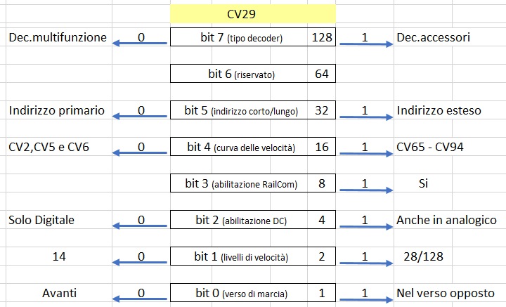 Con riferimento alla tabella che ho postato prima (vedi più su), il funzionamento anche in analogico si ottiene attivando il bit[2] della CV29. Bit[2] significa che il numero 2 deve essere elevato alla potenza indicata tra parentesi. Bit[0] significa: 2 elevato alla 0 che è uguale a 1. Bit[2] significa 2 elevato al quadrato che è uguale a 4, ecc. Questa CV è poi formata dalla somma dei vari bit e cioè può essere formata dalla somma di: 1 - 2 - 4 - 8 - 16 - 32 - 64 - 128.gnokketto ha scritto: ↑martedì 16 aprile 2024, 13:05 Buongiorno, qualche anima pia può spiegare (sono novello digitale) come impostare una loco digitale per funzionare anche in analogico ? (sia analogica che digitale) ho capito che è una funzione CV29 bit ... ma non sono come si fà e non vorrei fare troppi casini..![]()