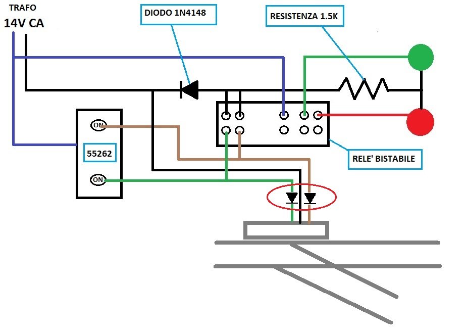 Salve a tutti, sono una NEW ENTRY del forum GAS TT ed anche un principiante in questa branca del modellismo, attesa la mia natura di modellista di aerei in scala in plastica. Sto realizzando il mio plastico in scala H0 con funzionamento analogico, da buon e consumato nostalgico, legato ai miei ricordi bellissimi di bambino con i miei trenini LIMA. Sul tracciato di questo plastico, in area stazione, vi sono 4 scambi della PIKO (DEL TIPO CON UNA SOLA DEVIAZIONE) con motori installati sottopancia, comandati da una pulsantiera sempre della PIKO modello 55262. Ho in dotazione un alimentatore della ROCO che fornisce 15 volts in corrente alternata per l'alimentazione dei motori degli scambi anzidetti. Il mio problema è quello di poter osservare sul quadro sinottico, per ogni singolo scambio, due LED, uno di colore rosso e l'altro verde, tali da indicarmi la posizione dello scambio da me impostata dopo la pressione dei relativi pulsanti della citata pulsantiera. Quindi, per esempio, alla pressione dei singoli pulsanti contrassegnati dal colore rosso si accenderanno sul quadro altrettanti LED rossi che mi indicano una determinata posizione degli scambi azionati, mentre con la pressione dei singoli pulsanti di colore verde si avrà l'accensione dei corrispondenti LED verdi sul quadro che riportano gli scambi interessati nella posizione originaria. Come si può ottenere un simile effetto di funzionamento e riscontro sul quadro sinottico ? Qual è il necessario schema elettrico di montaggio del circuito da realizzare, e se esiste un simile circuito, magari semplice ? Potreste aiutarmi in tal senso ? Infine tengo a far notare come il circuito da me pensato non và ad interessare od interferire in alcun modo con l'alimentazione dei binari, per mia precisa scelta. Vi ringrazio per l'attenzione e per i consigli che sono certo saprete darmi considerato che si tratta del mio primo plastico ferroviario in cui mi stò cimentando. Grazie a Voi tutti e attendo con ansia, speranzoso.