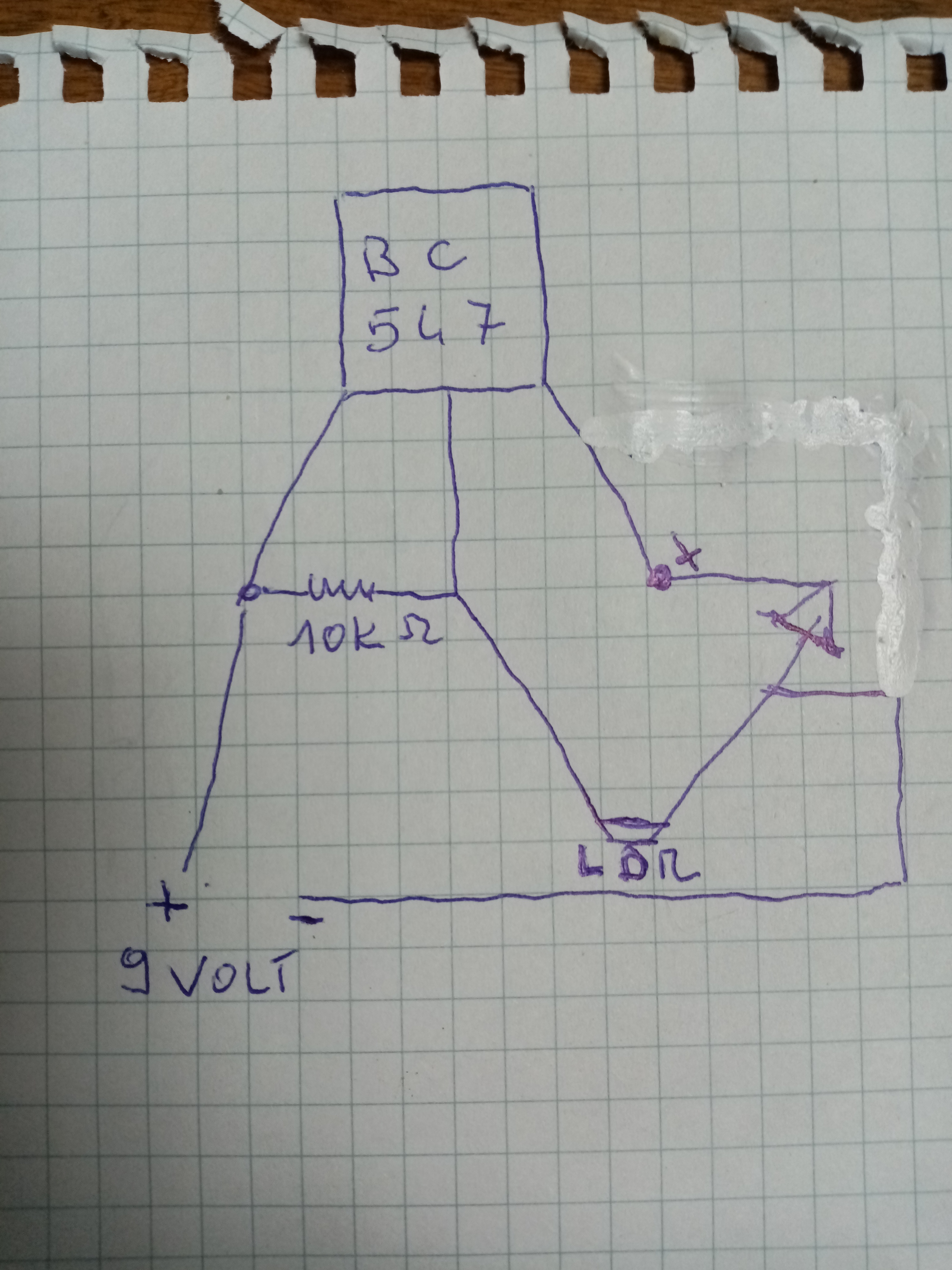 Dunque al collettore è saldata la resistenza da 1o k ohm che a sua volta è saldata al piedino di base ( quello al centro ) e sempre al collettore c'è saldato il positivo dei 9v, alla base ci ho saldato un piedino della fotoresistenza (LDR) e all'altro piedino della fotoresistenza ho saldato il negativo di un led e il negativo dei 9v, il positivo del led è saldato sull'emettitore del transistor. Il mio progetto sarebbe di sostituire i 9v con 12v e sostituire il led con un relè bistabile da poter fare funzionare un blocco automatico dei treni.