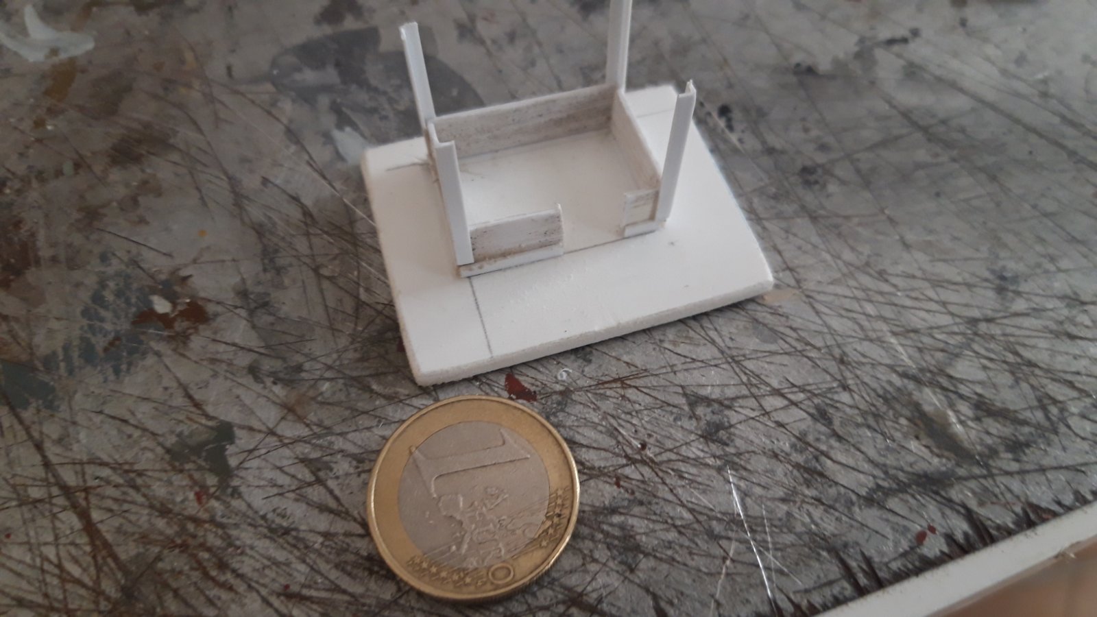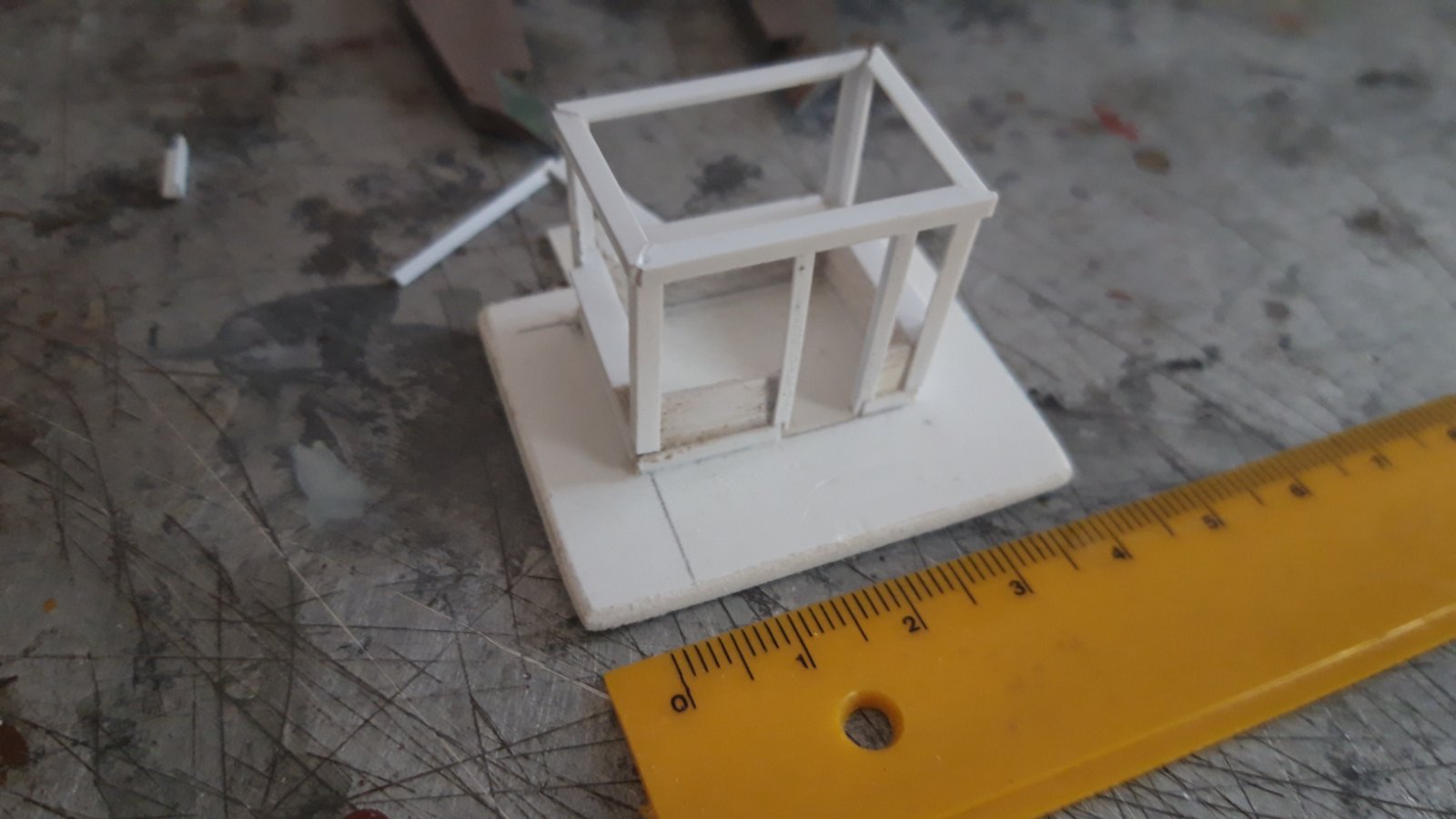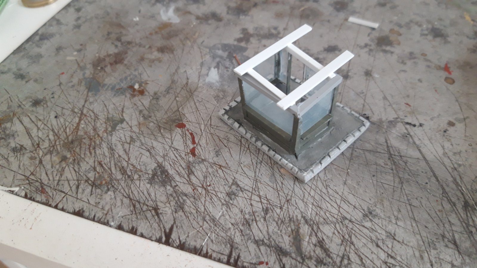 Ovviamente la base è forex al quale ho incollato degli angolari evergreen e plasticard. Poi ho iniziato a verniciare un po', creando anche le pietre marciapiedi ed incollado del acetato per le vetrate.