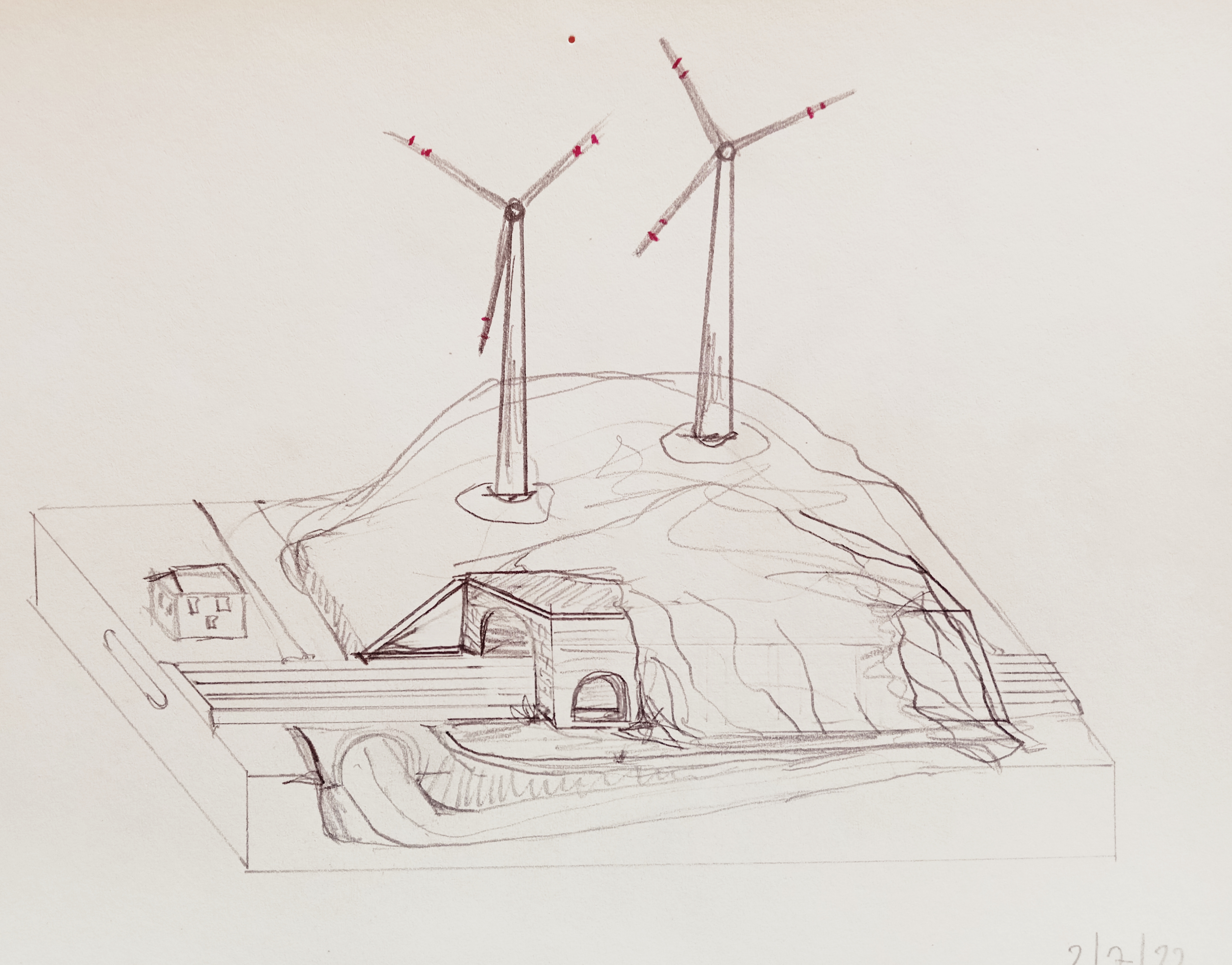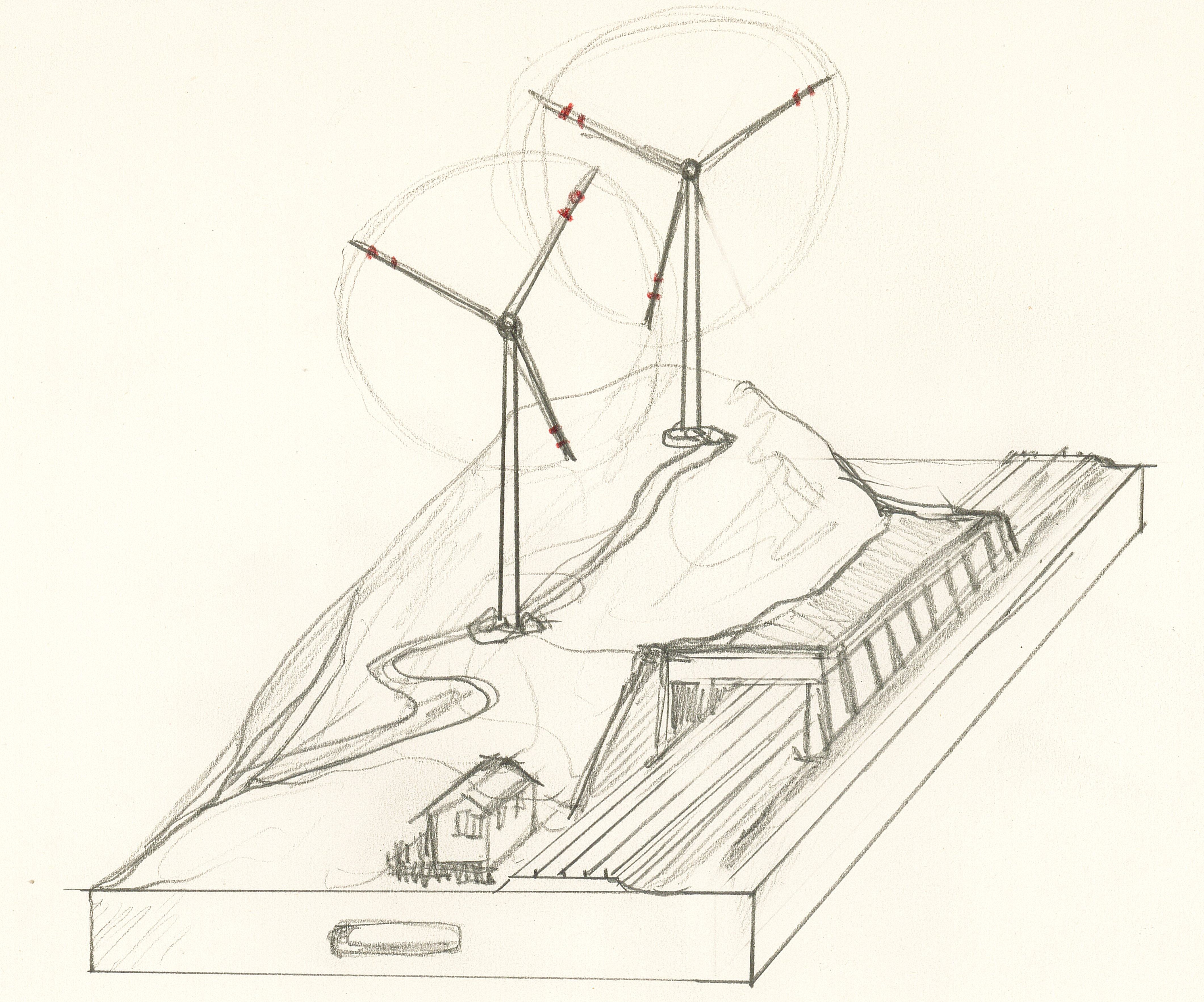 Non essendo molto pratico di grafica computerizzata, ho provato a fare un paio di schizzi per la possibile realizzazione, prevedendo due pale eoliche funzionanti ed eventualmente una terza in fase di costruzione... PS le proporzioni non sono molto ben rispettate, spero possa rendere l'idea [101]