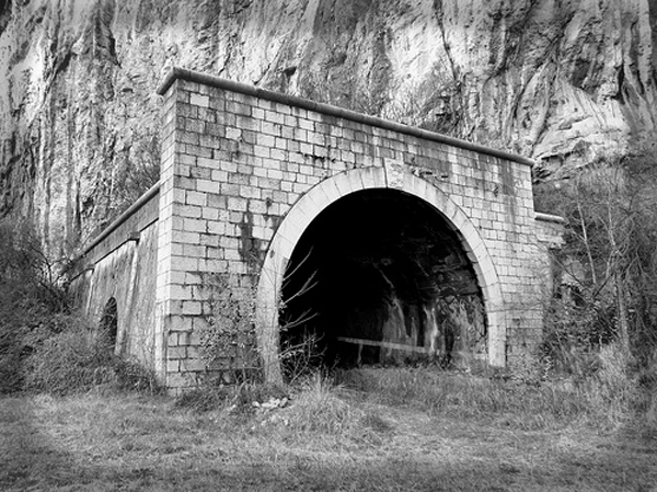 Per il portale della galleria pensavo di ispirarmi a questa: la vecchia galleria di Ceraino lungo la ferrovia del Brennero, dismessa dalla fine degli anni '90 sostituita da una variante del tracciato: