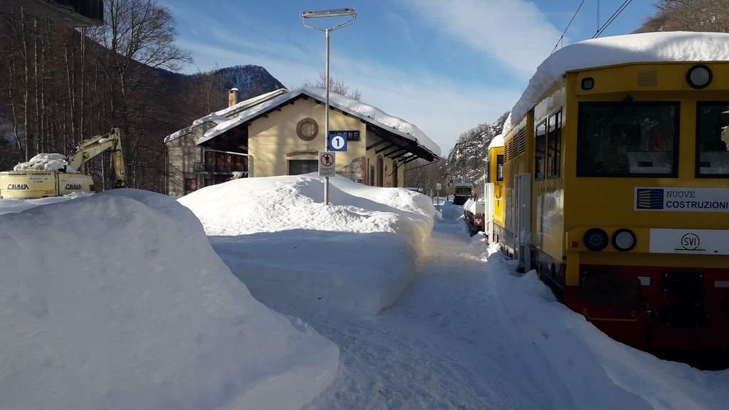 Partiamo in orario, quindi ci dirigiamo verso Centallo, per poi giungere a Cuneo alle 13:49. In questa tratta la ferrovia scorre nella pianura cuneese, una area poco urbanizzata ma ricca di attività agricole e allevamenti. Lo scalo di Cuneo è interessato da un discreto traffico merci, con treni per il trasporto di acqua minerale ma soprattutto diversi servizi per il trasporto di cereali verso i numerosi mangimifici della zona, che servono a rifornire le attività dell'allevamento che si notano numerose percorrendo la tratta tra Torino e Cuneo. Lasciata la stazione di Cuneo procediamo verso Borgo San Dalmazzo e Roccavione, quindi iniziamo la risalita della valle Vermenagna, dove l'ambiente si distacca decisamente da quello precedente. Superata Cuneo la ferrovia risale la valle fra le montagne, che sono ricoperte da una spessa coltre di neve e la ferrovia assume le caratteristiche di una linea di montagna. Costeggiamo due grossi stabilimenti per la produzione di cemento, ci cui uno, quello di Robilante, è collegato alla ferrovia. Lo stabilimento Buzzi Unicem di Robilante utilizza i minerali estratti in una vicina cava per la produzione del cemento, successivamente diversi materiali sono movimentati in treno. Lo stabilimento dispone di un impianto di carico/scarico del carri ed è raccordato alla ferrovia nella stazione di Robilante. Diversi carri tramoggia sono fermi nello scalo a servizio del cementificio, mentre un treno merci è pronto a partire verso Trino Vercellese, dove Buzzi ha un altro stabilimento, sempre raccordato alla ferrovia e con il quale avvengono gli scambi di materiale. Dopo avere effettuato la fermata a Robilante saliamo verso Vernante, quindi percorriamo diverse gallerie, tra cui una elicoidale, che ci permette di guadagnare una notevole quota e raggiungere Limone Piemonte alle 14:28.
