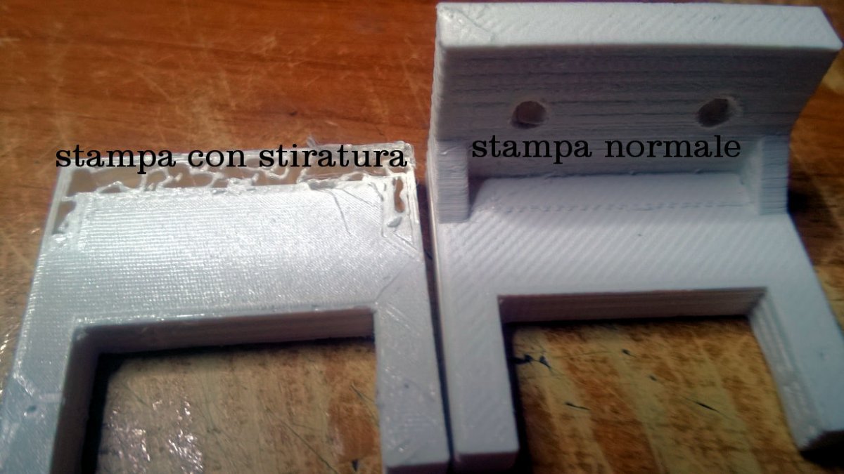 Ho fatto la prova della stiratura con la mia stampante, effettivamente il sistema riesce a lisciare abbastanza bene la superficie (solo in orizzontale), unico neo quando riprende ad estrudere il materiale per continuare la stampa normale si ritrova ad un momentaneo blocco dovuto al materiale depositato nella punta dell'ugello, questo purtroppo crea il problema che non depositandosi uno strato non esiste più l'appoggio per gli strati successivi con conseguente versamento a vuoto e non completamento dell'oggetto