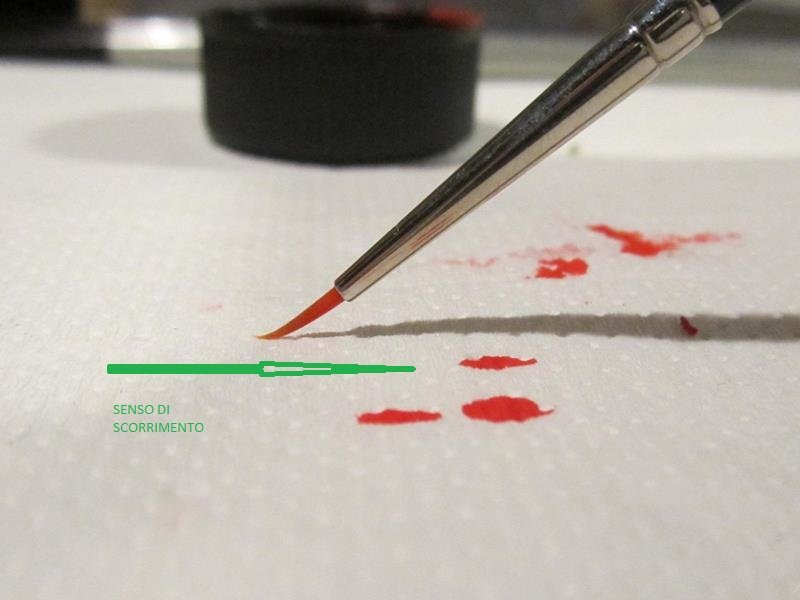 per eliminare l'eccesso di colore sfregheremo le setole su un panno carta da cucina sempre in un senso da sinistra verso destra in modo da far scorrere il residuo di colore dalle setole verso la punta.