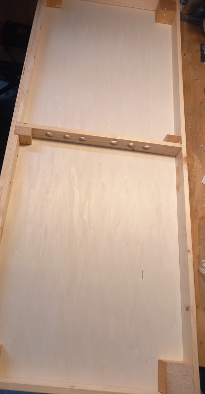 QUINDI ho deciso di mettere COMUNQUE un fondo di compensato, eccolo qui, avvitato al telaio di base: Dopodiché ho incollato (solo tra di loro) i due pannelli da 2 cm (totale 4cm di altezza) con la poliuretanica: