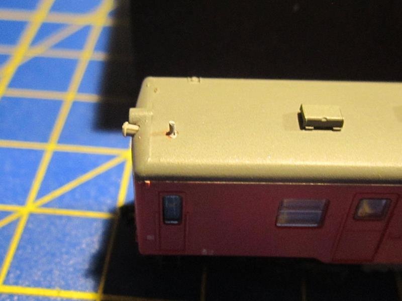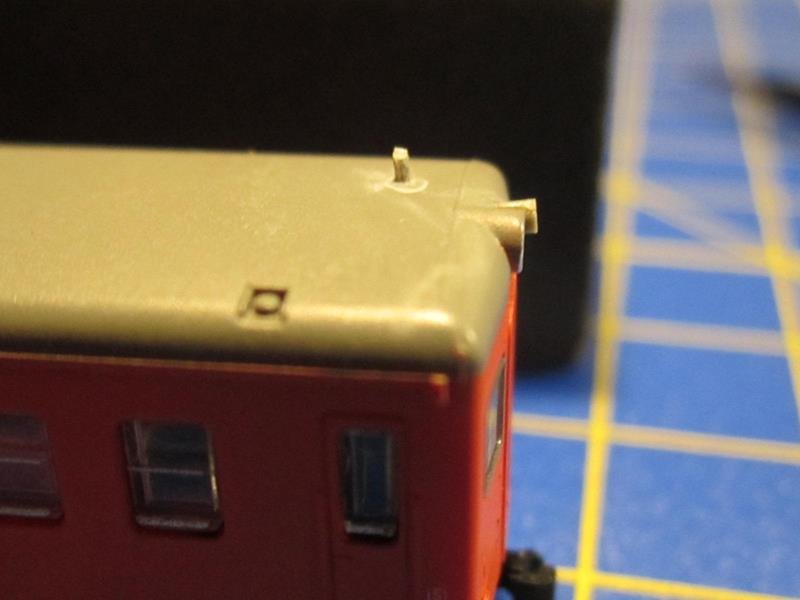 Le trombe vanno fermate con un puntino di colla, mentre per i fischi che causa la loro dimensione veramente microscopica non permettono un facile montaggio ho optato di sostituirli con un filo di sprure . Si taglia un pezzettino della misura utile ad essere afferrato ( quello originale è talmente piccolo che è facile perderlo afferrandolo con le pinzette ) con le pinzette, lo incolliamo negli appositi fori, una volta ben fissato lo regoliamo in altezza ( in questa scala basta un accenno di simulacro anche non dettagliato, non si riesce a vedere molto a un metro di distanza quando gira sul plastico ). Sostituire i fischi anche se li perdiamo non ci crea problemi possiamo farne quanti ne servono