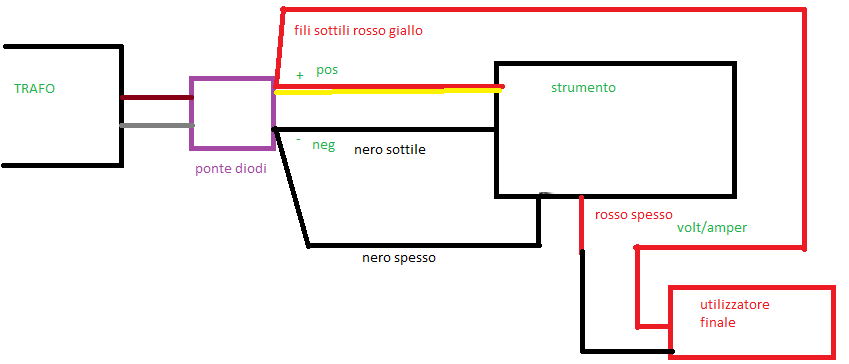 Con questo primo collegamento alimentiamo lo strumento.Occorre alimentare lo strumento con la corretta polarizzazione quindi servirà un ponte diodi