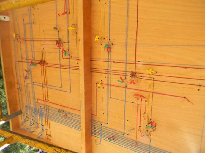 oltre al bell'ordine dei fili, noterete che sulla traversa sono state praticate delle "feritoie" che consentono ai fili di passare tra piano e traverse stesse... mi sembra una bella soluzione che credo adotterò!
