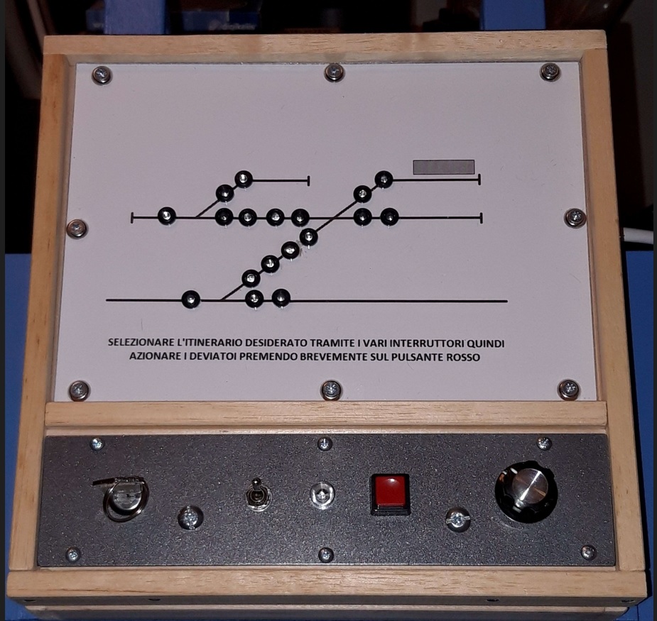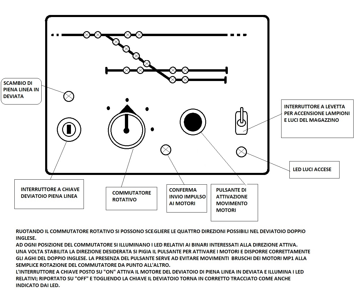 Il commutatore rotativo permette di scegliere visivamente con i led l'itinerario desiderato sul deviatoio inglese doppio; una volta stabilito l'itinerario si preme il pulsante per muovere adeguatamente i motori (un led rosso si accende per confermare l'invio del comando ai motori). A destra c'è un interruttore per l'accensione delle luci del modulo (edifici, lampioni).