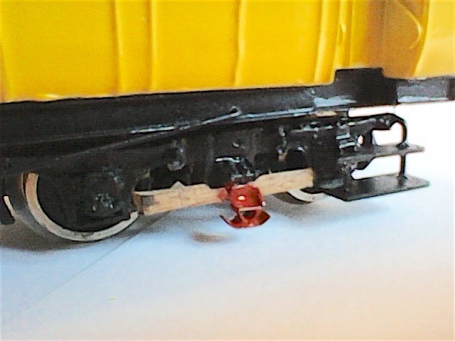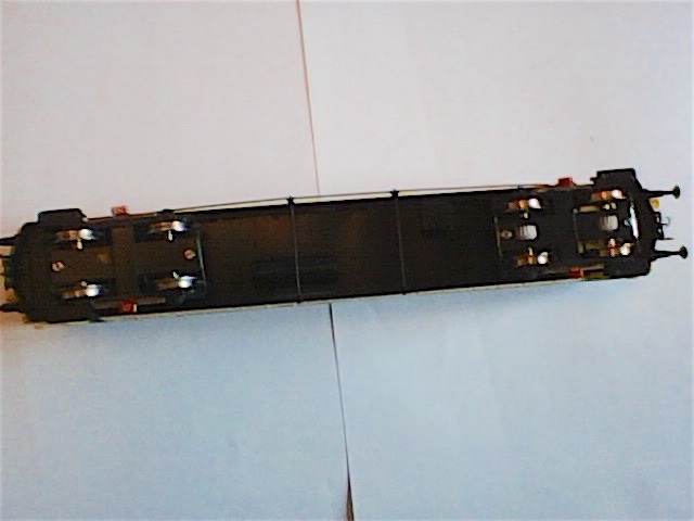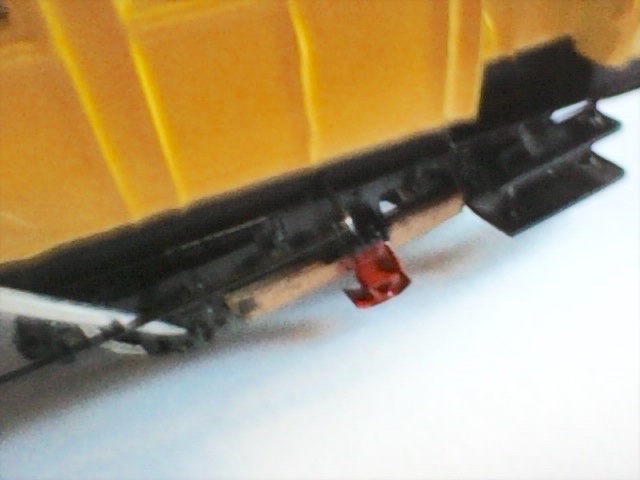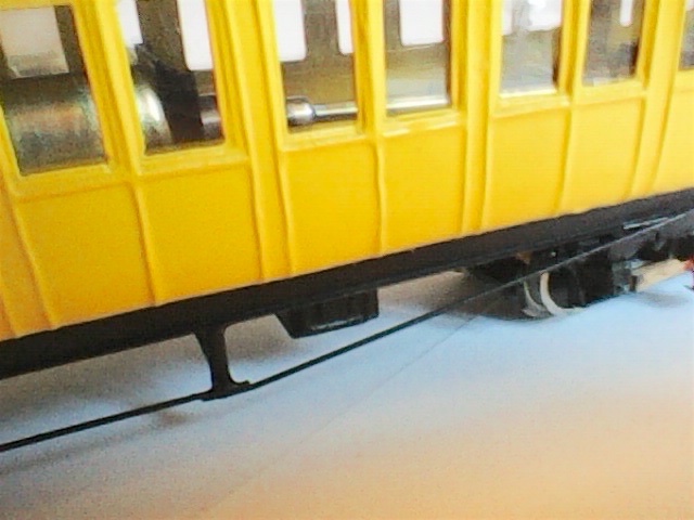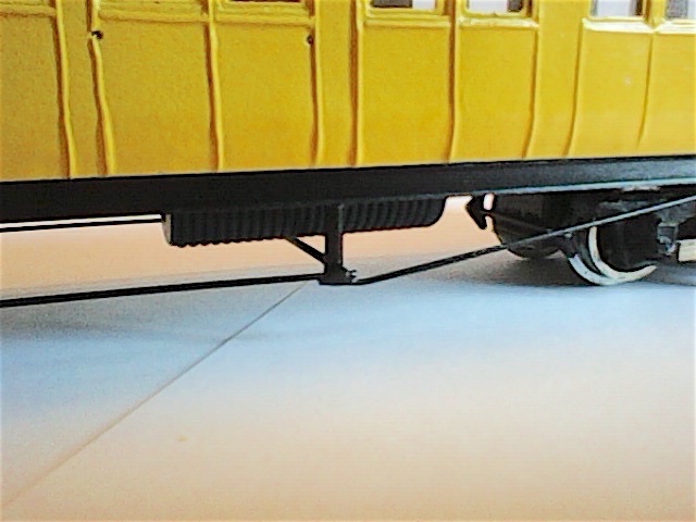 I particolari dei carrelli sono bi-clonati dal carrello di una carrozza centoporte (clone iniziale + ri-clone dopo accorciatura a misura), non sono il massimo ma ho cercato di accomodarli su cover fissabili dal basso. I ceppi dei freni sono clonati da un master metallico ed inseriti su perni saldati al telaio dei carrelli.