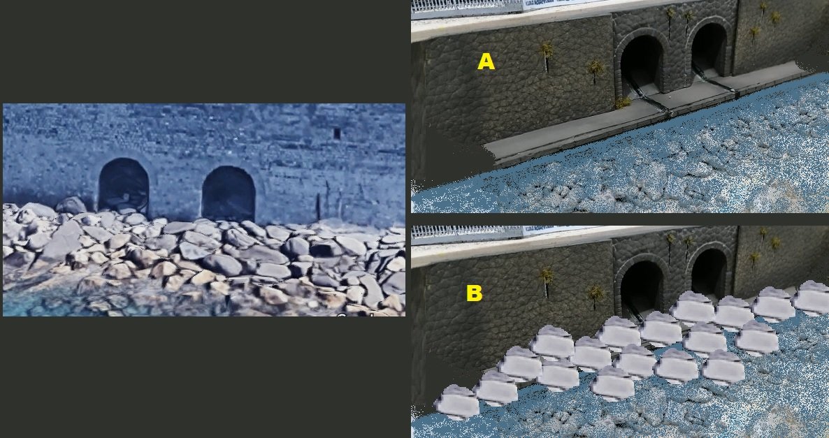 Cari amici ho bisogno dei vostri consigli.Secondo voi nell'immagine "A" se il livello del mare arriva al bordo delle pietre è realistico?Cioè se nella realtà il mare fosse mosso, entrerebbe dentro :cry: :cry: :cry: