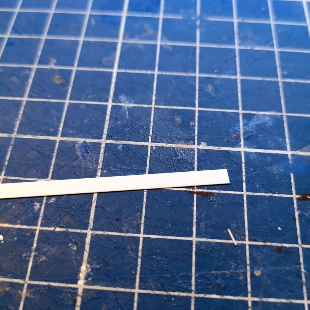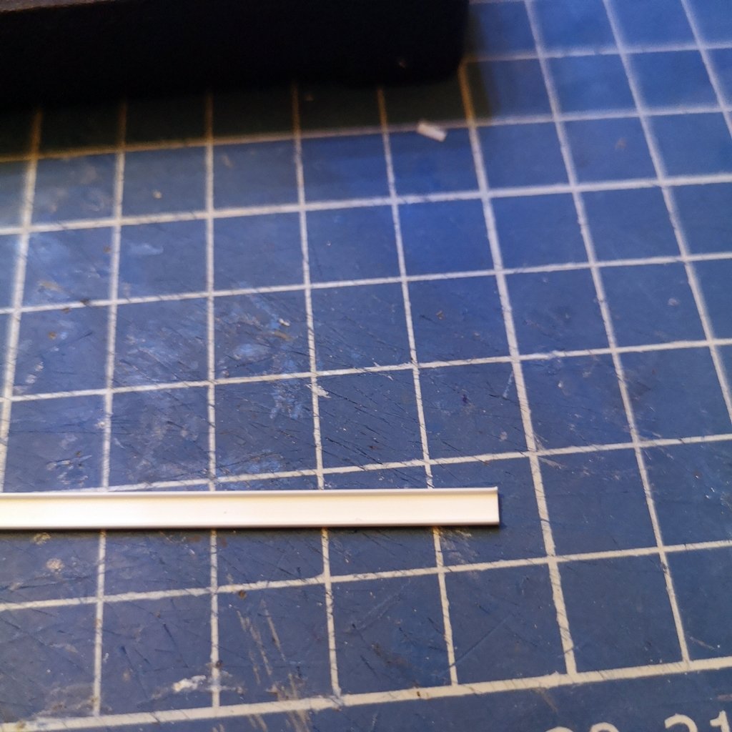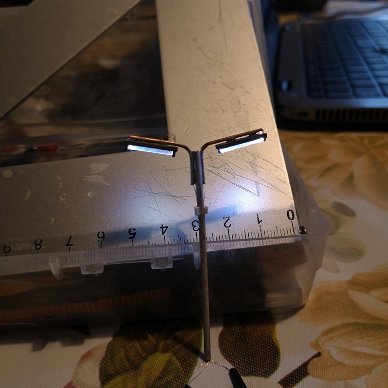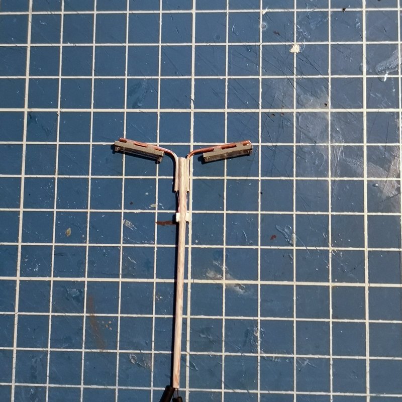 - base plafoniera lunghezza 14 mm larghezza 4 mm con laterali alti 1 mm - chiusura laterale plafoniera con profilato da 4 mm e rifilatura - inserimento guide interne per posizionamento fibra ottica e foratura da 0,5 mm per passaggio fili microled - inserimento supporti interni per microled e fibra ottica da 1,5 mm e supporti superiori per attacco al braccio portante da 2 mm - inserimento microled - incollaggio della plafoniera al braccio e cablaggio del filo all'interno dello stesso ed all'interno del palo centrale e coperti i fori del palo con profilato ad "U" da 2 mm - ripetizione di quanto sopra per l'altro braccio e cablaggio finale - inserimento della fibra ottica lunghezza 12 mm fissata con cianoacrilato gel, ma non è il collante ideale - prova luci con i microled in serie e resistenza da 2,2kohm
