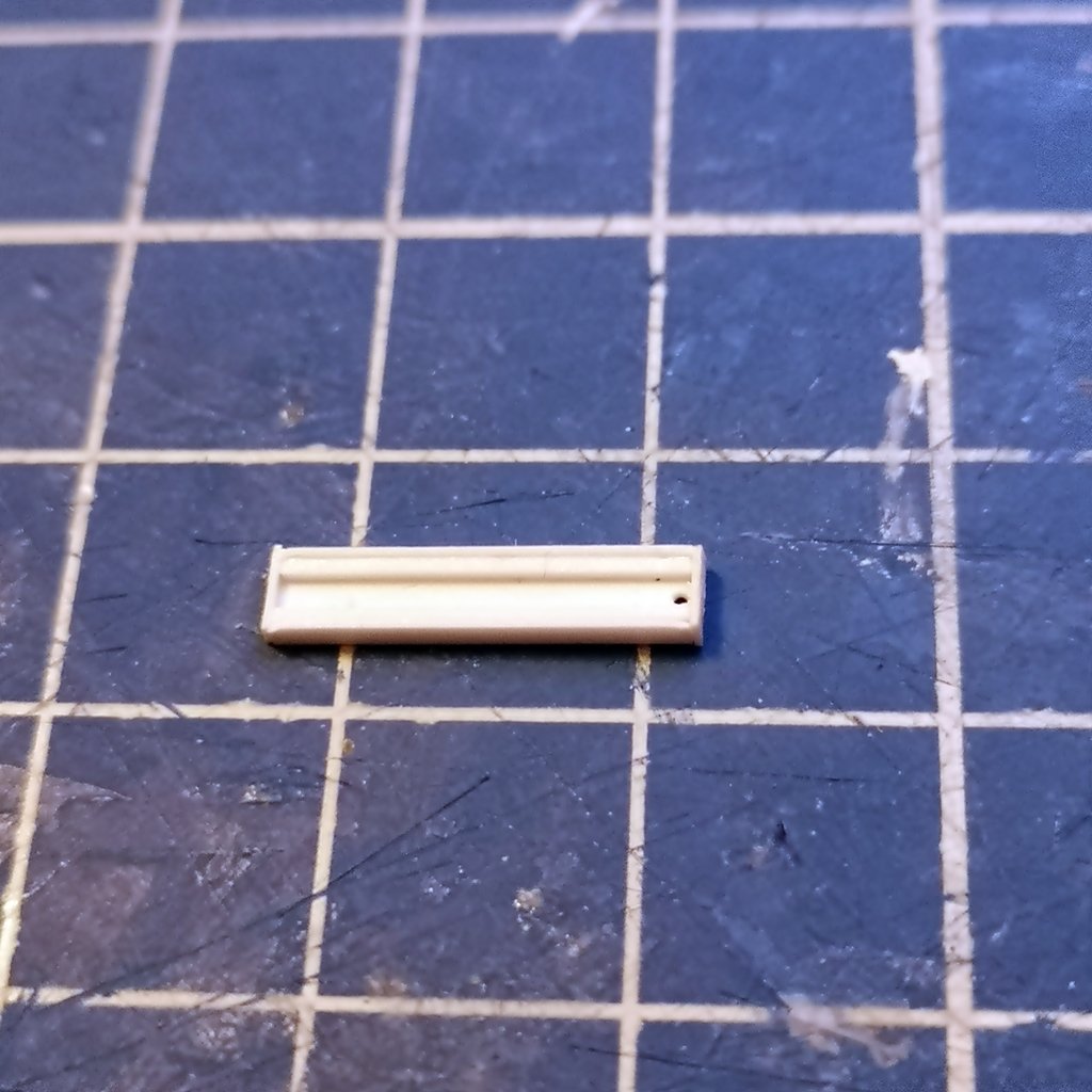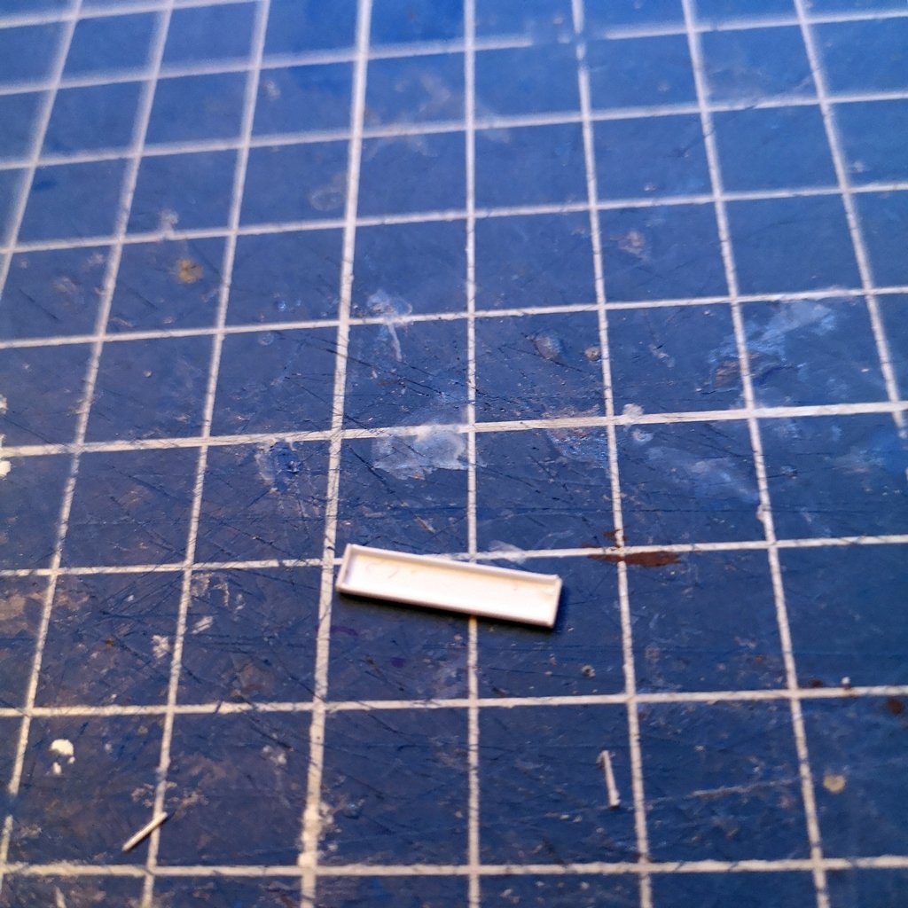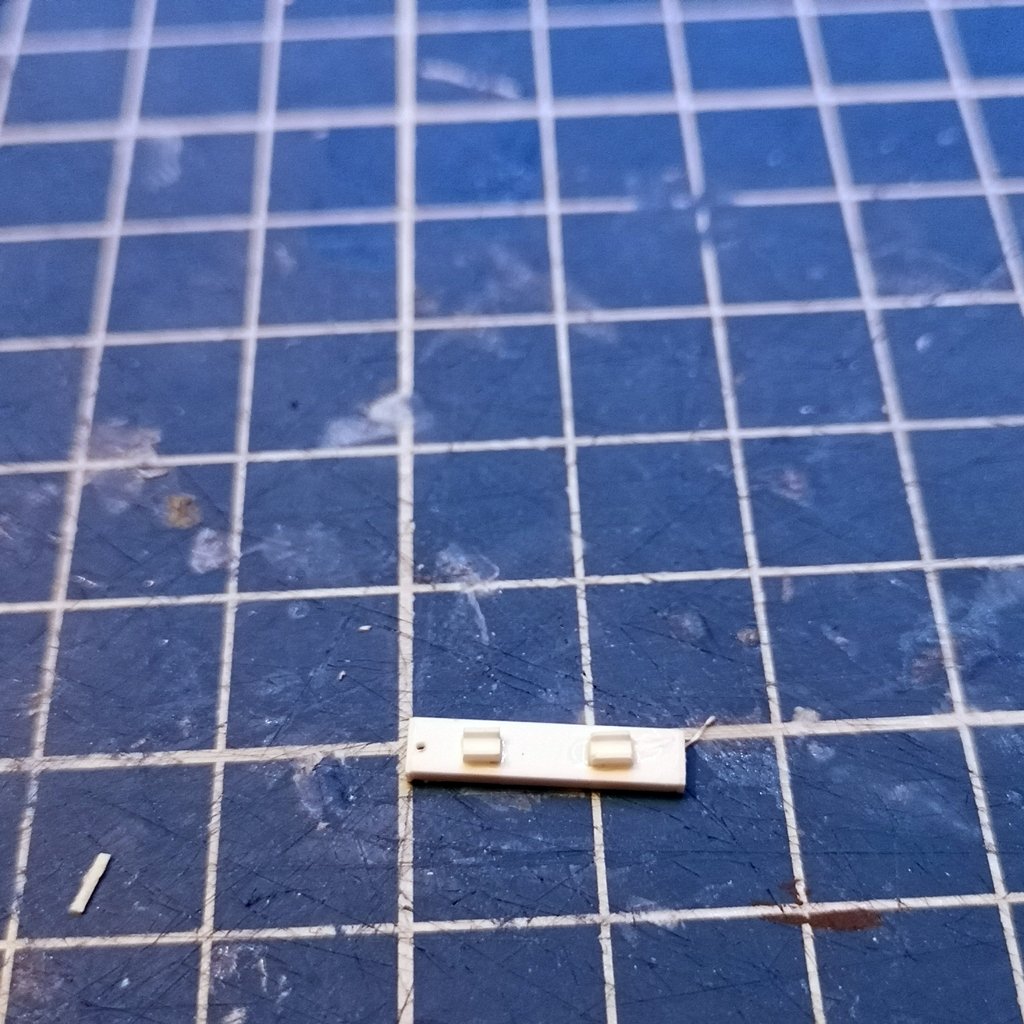 - base plafoniera lunghezza 14 mm larghezza 4 mm con laterali alti 1 mm - chiusura laterale plafoniera con profilato da 4 mm e rifilatura - inserimento guide interne per posizionamento fibra ottica e foratura da 0,5 mm per passaggio fili microled - inserimento supporti interni per microled e fibra ottica da 1,5 mm e supporti superiori per attacco al braccio portante da 2 mm - inserimento microled - incollaggio della plafoniera al braccio e cablaggio del filo all'interno dello stesso ed all'interno del palo centrale e coperti i fori del palo con profilato ad "U" da 2 mm - ripetizione di quanto sopra per l'altro braccio e cablaggio finale - inserimento della fibra ottica lunghezza 12 mm fissata con cianoacrilato gel, ma non è il collante ideale - prova luci con i microled in serie e resistenza da 2,2kohm