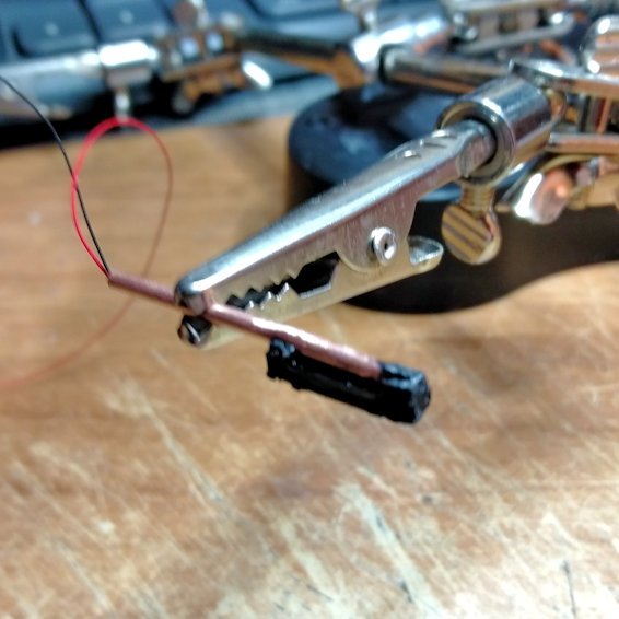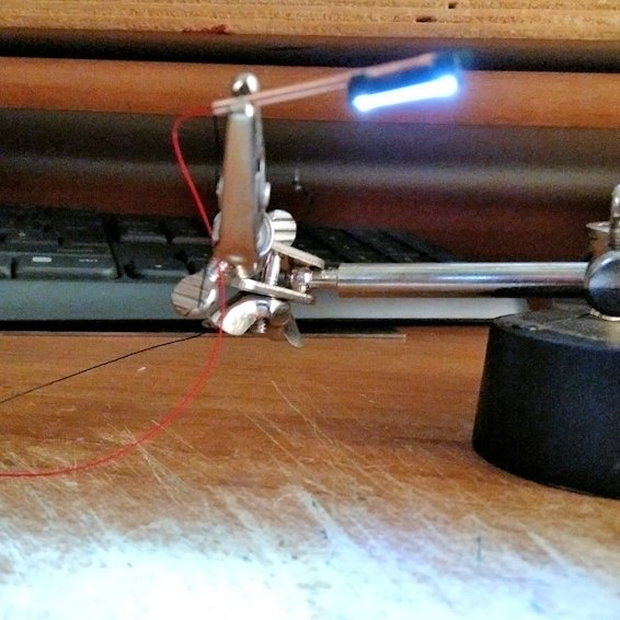 Per piegare il tubo di rame da 1 mm ho preso una bussola (carrucola) di modellismo navale, l'ho fissata con un chiodo su un pezzo di legno, poi ho tenuto fermo il tubicino fra il legno e la bussola con una mano e con un dito ho scorso lungo il tubo dal basso verso l'alto piegando il tubo all'interno della bussola fino ad ottenere l'angolo desiderato.