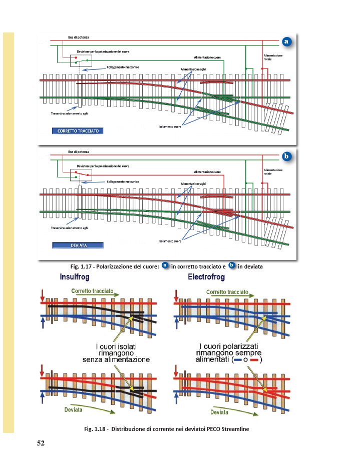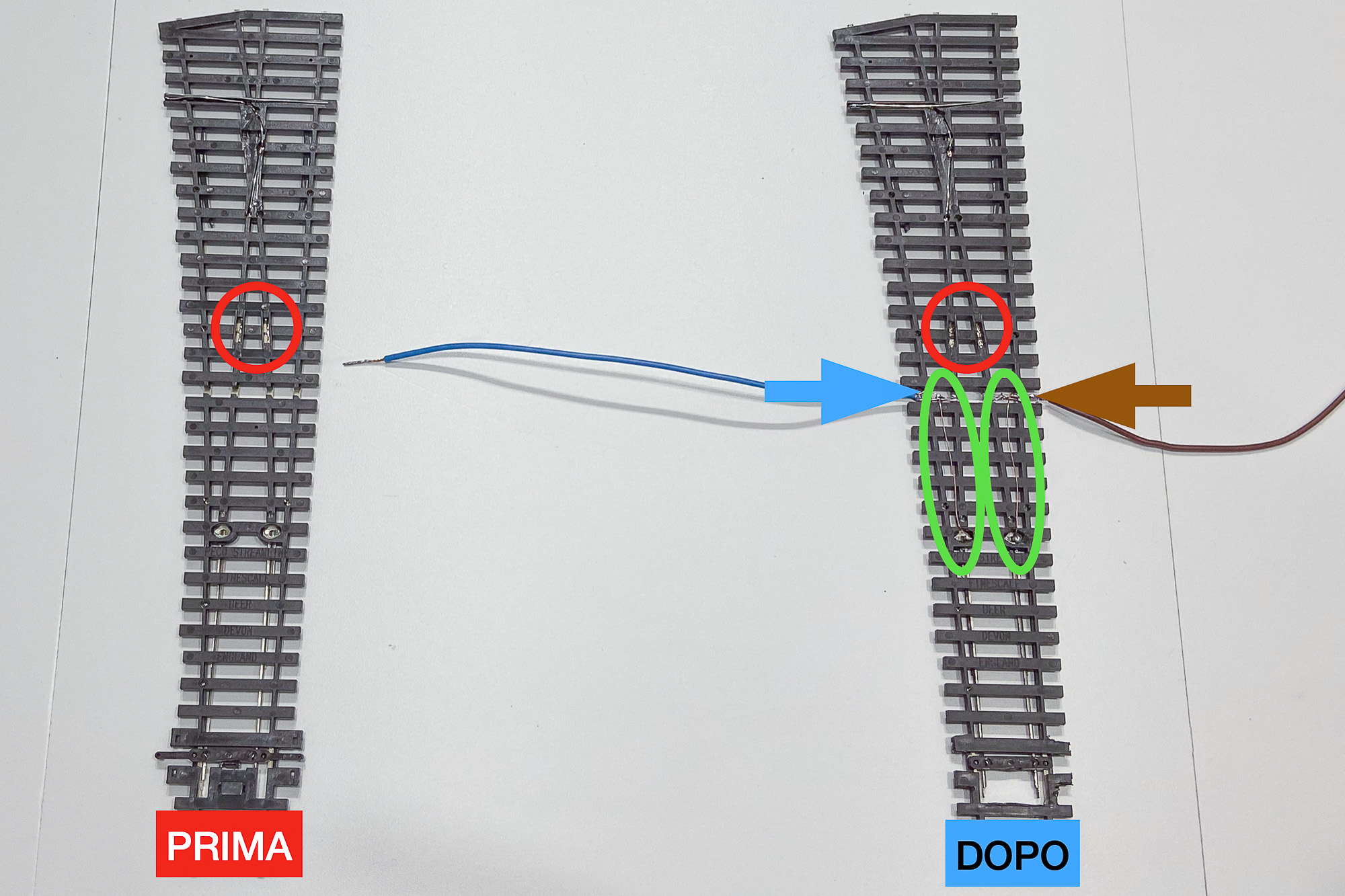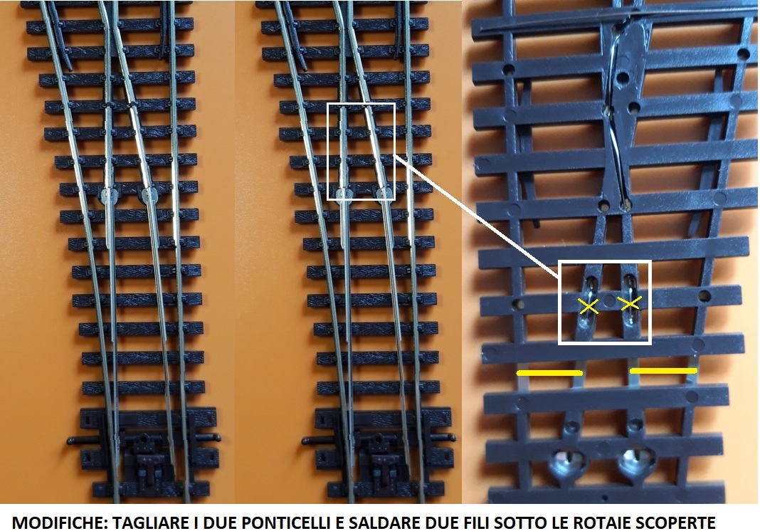 Nella seconda immagine riportata da Roberto, le istruzioni si limitano al taglio dei ponticelli e omettono di suggerire la saldatura dei fili elettrici a ponte tra rotaie esterne e parti fisse di ancoraggio degli aghi. Questo significa che gli aghi e la loro parte fissa di ancoraggio dipendono, come alimentazione, dal solo contatto ago-rotaia, che con il tempo può non essere così efficiente sia per motivi meccanici (non perfetta aderenza ago-rotaia) che di conduzione (sporcizia, presenza di corpi estranei, ossidazione)