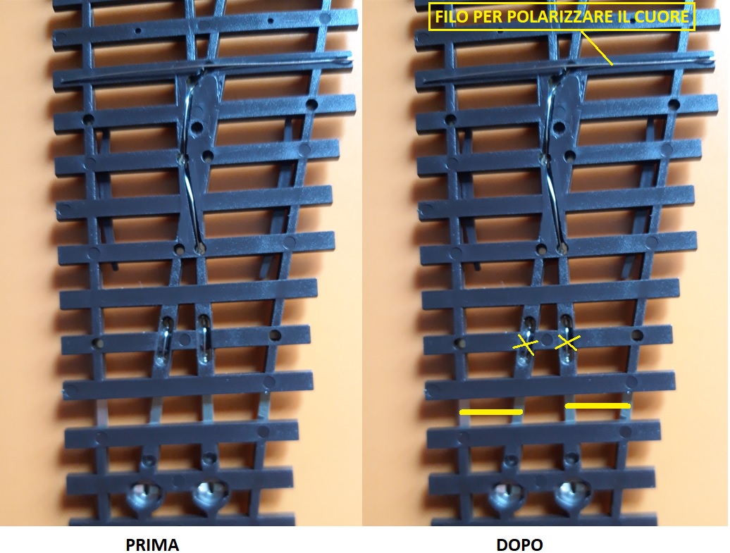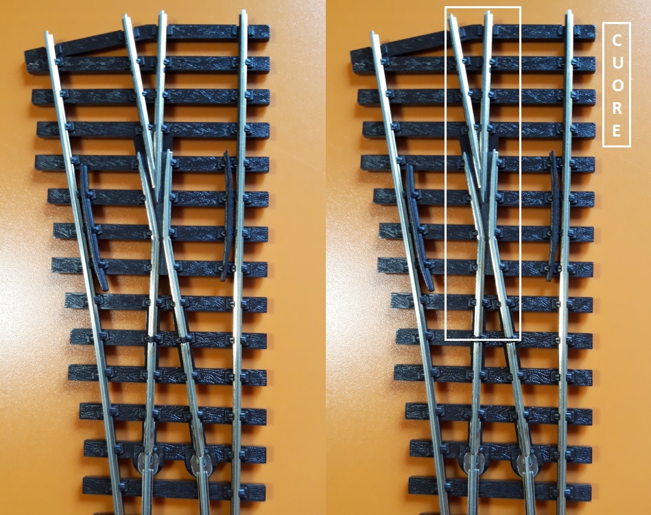 La modifica consisteva nel disgiungere elettricamente la parte degli aghi, e dei brevi tratti fissi di rotaia a cui erano incernierati, dal cuore vero e proprio, sfruttando una discontinuità già presente; bastava infatti tagliare i due piccoli ponti elettrici sottostanti.