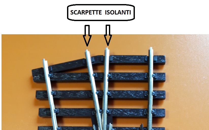 Si provvedeva poi all’alimentazione del tratto disgiunto saldando due fili elettrici, a ponte, tra i tratti fissi e le rotaie esterne, in modo da non dipendere solo dal contatto tra ago e rotaia.