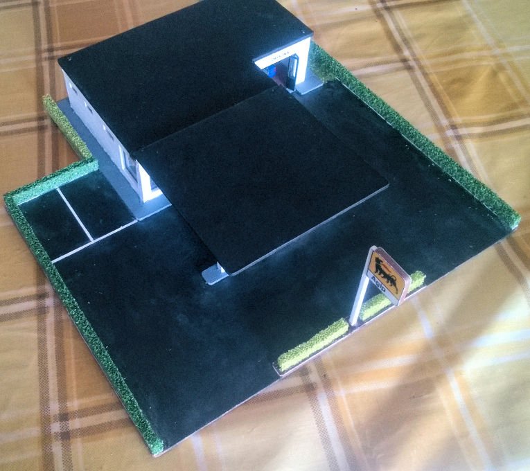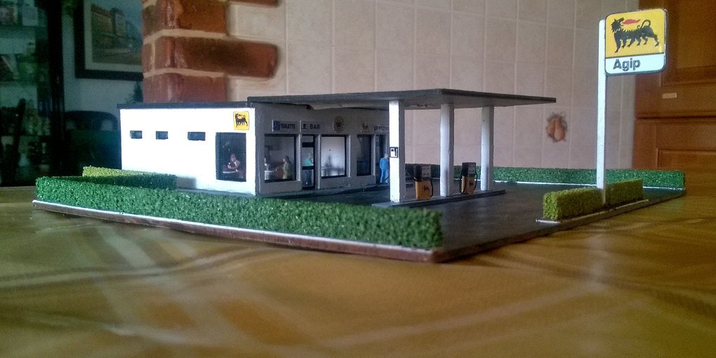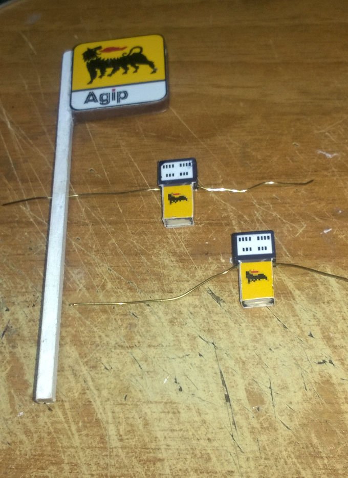 ho usato questa procedura, tagliati a misura due pezzettini di compensato da 3mm, li ho lavorati a lima sul fianco per creare la base, li ho poi rivestiti con i colori dell'agip utilizzando una stampa su carta fotografica, per i tubi ho invece usato del cavo in ottone da 0,5mm che dovrò successivamente dipingere di nero, stesso procedura anche per l'insegna