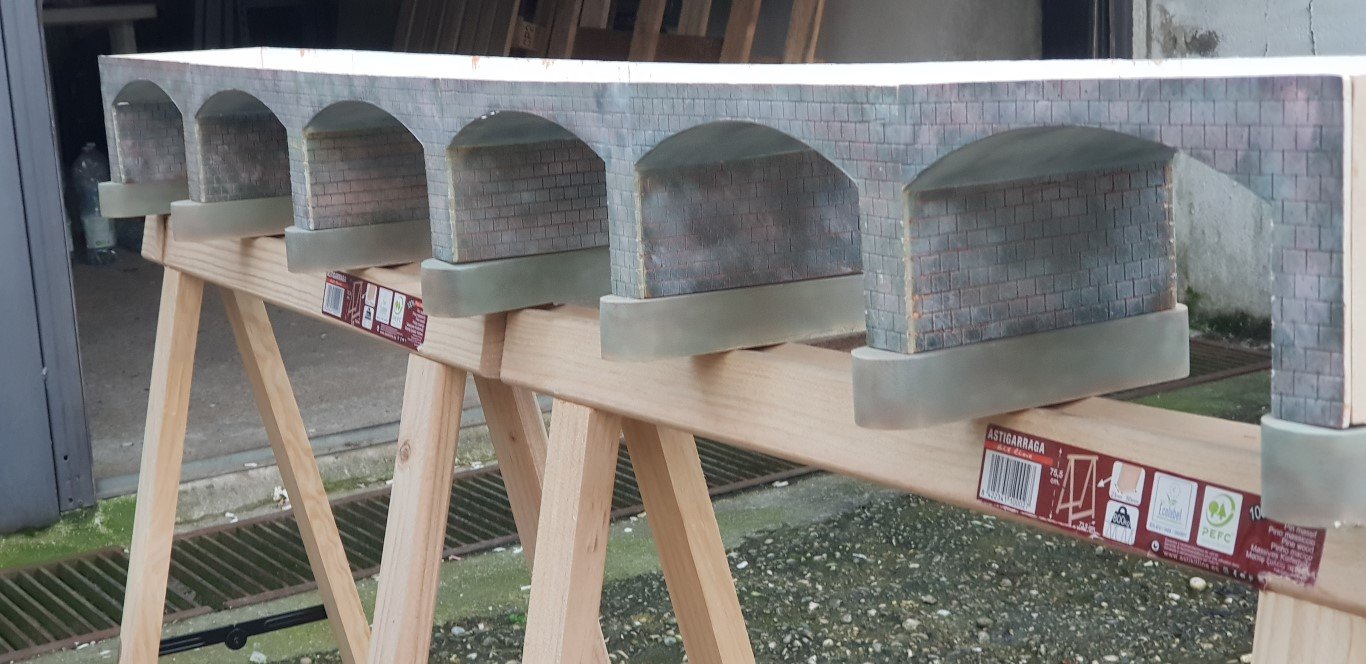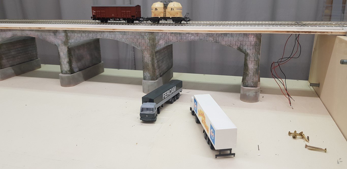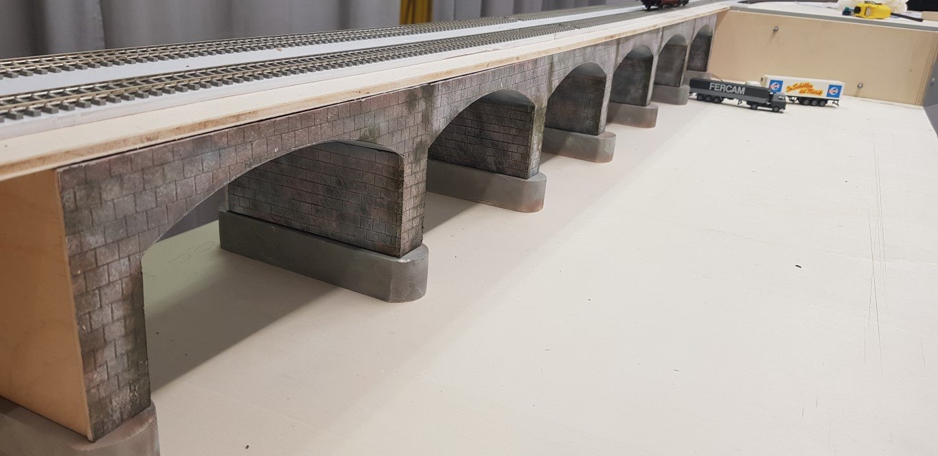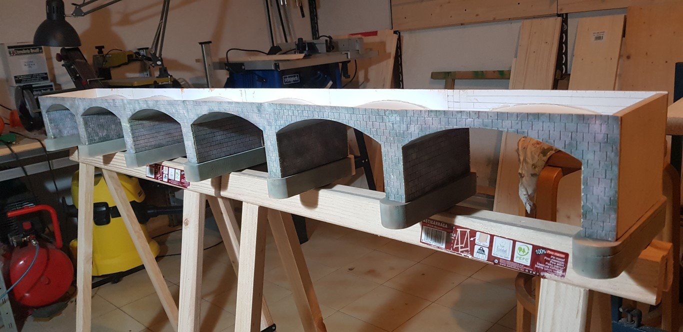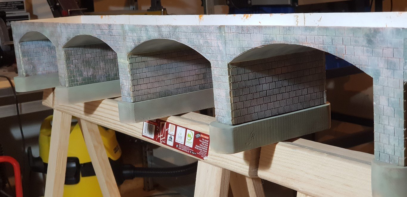 Quando tutto il ponte sarà completo, allora potrai dargli i colpi finali, le colate di sporco/calcare, ruggine. Le pietre hanno infinite tonalità, col pennello a secco puoi usare ocra, terra rossa bruciata (ruggine), verde vescica, bianco, grigio scuro, giallo napoli, sovrapponendoli, senza attendere che asciughino, ottieni altre tonalità, poi la predominanza di un colore sugli altri è a gusto personale.