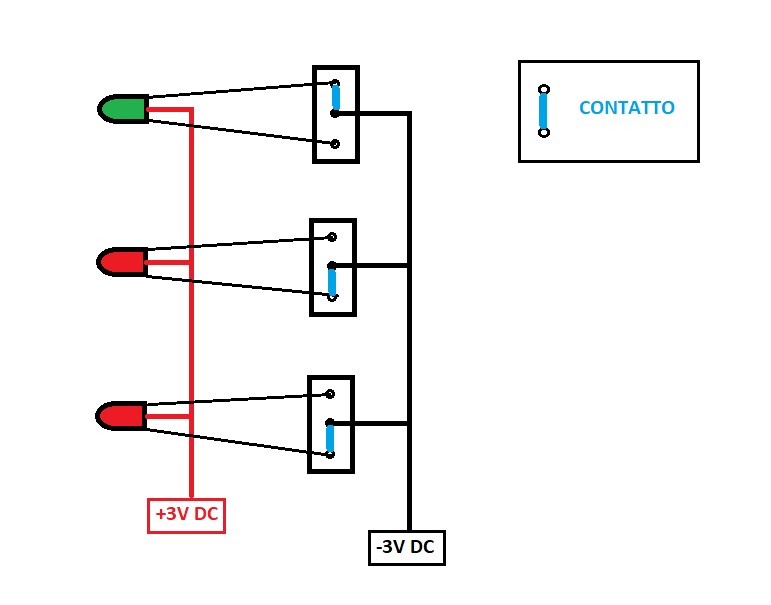 Ti ripropongo i collegamenti, specificando che, così come sono, avrai i 3 led sempre accesi per i 3 sezionamenti. A seconda del tipo di contatto i led saranno rossi o verdi.